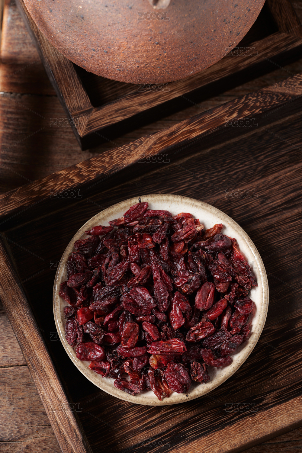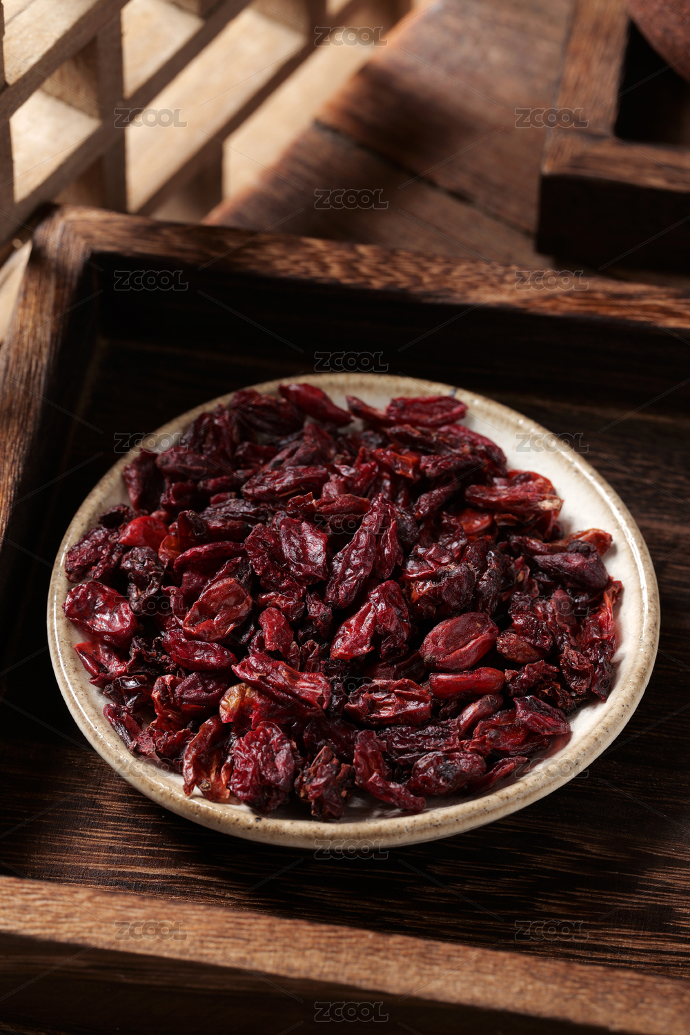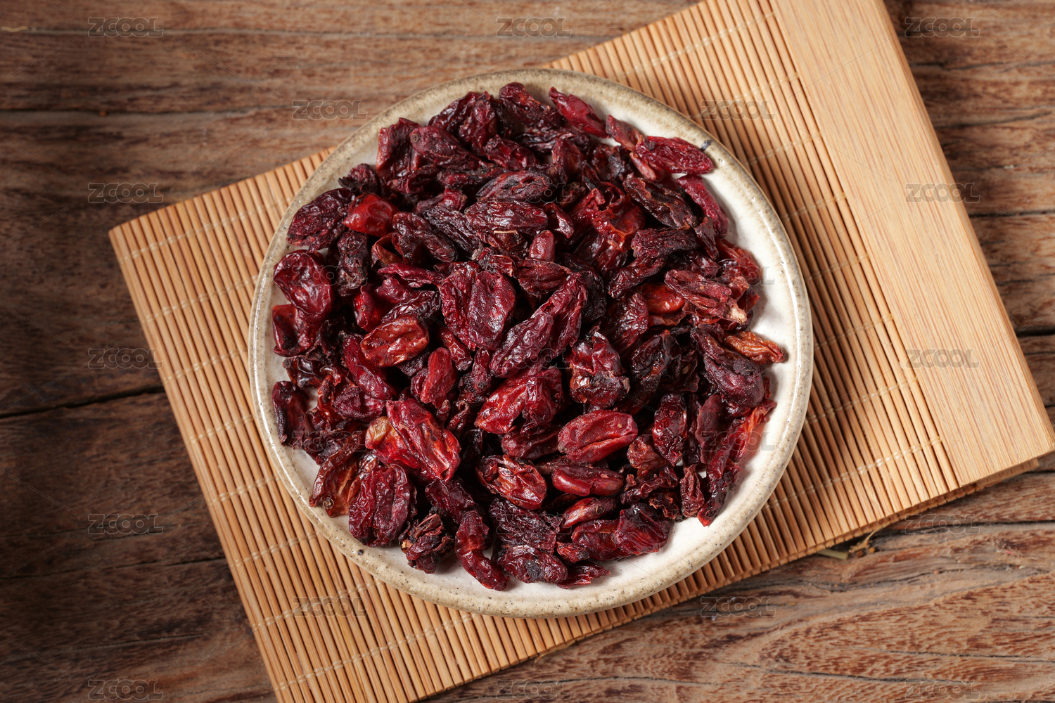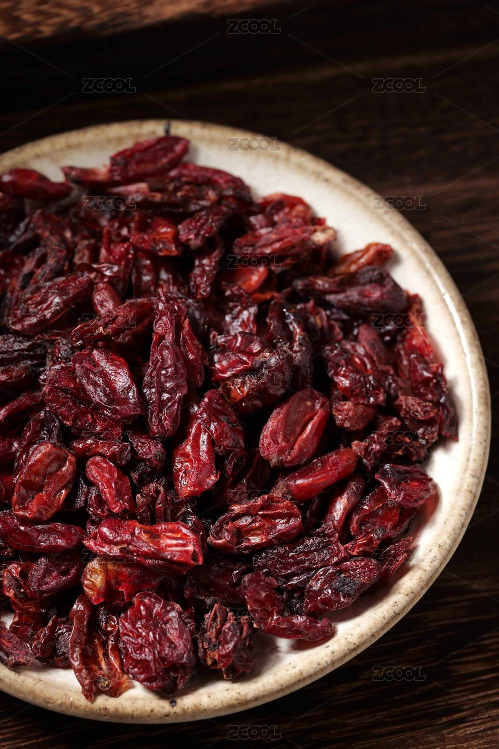 桌面上的盤子里的干爽的山茱萸