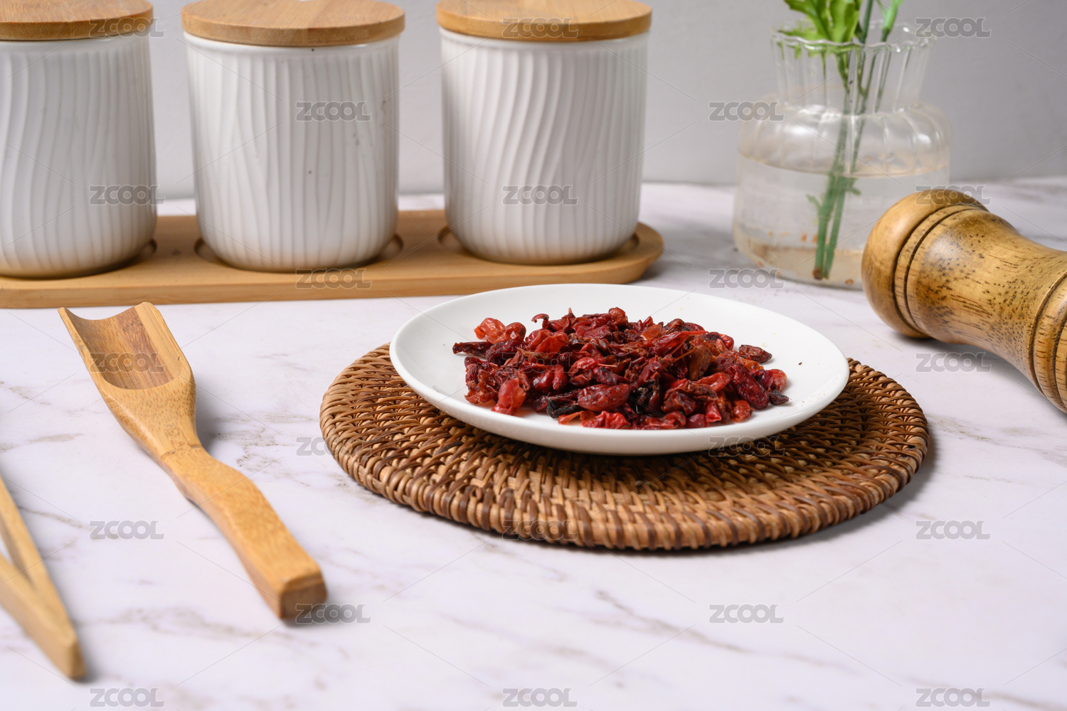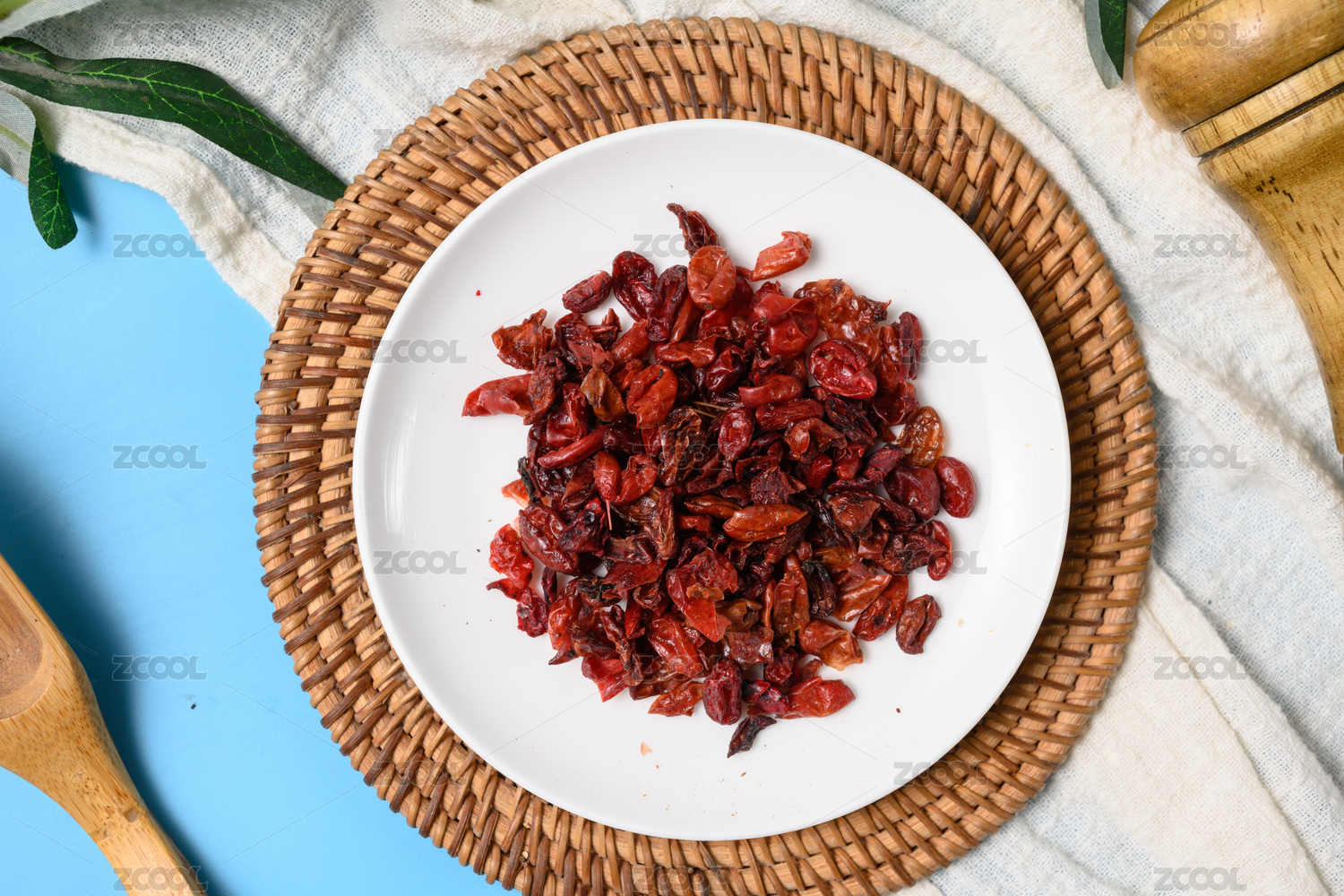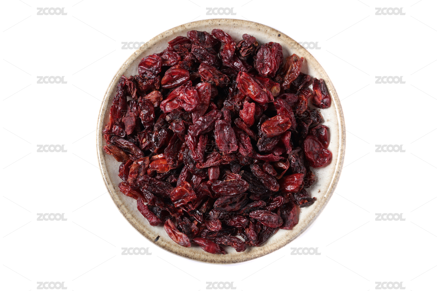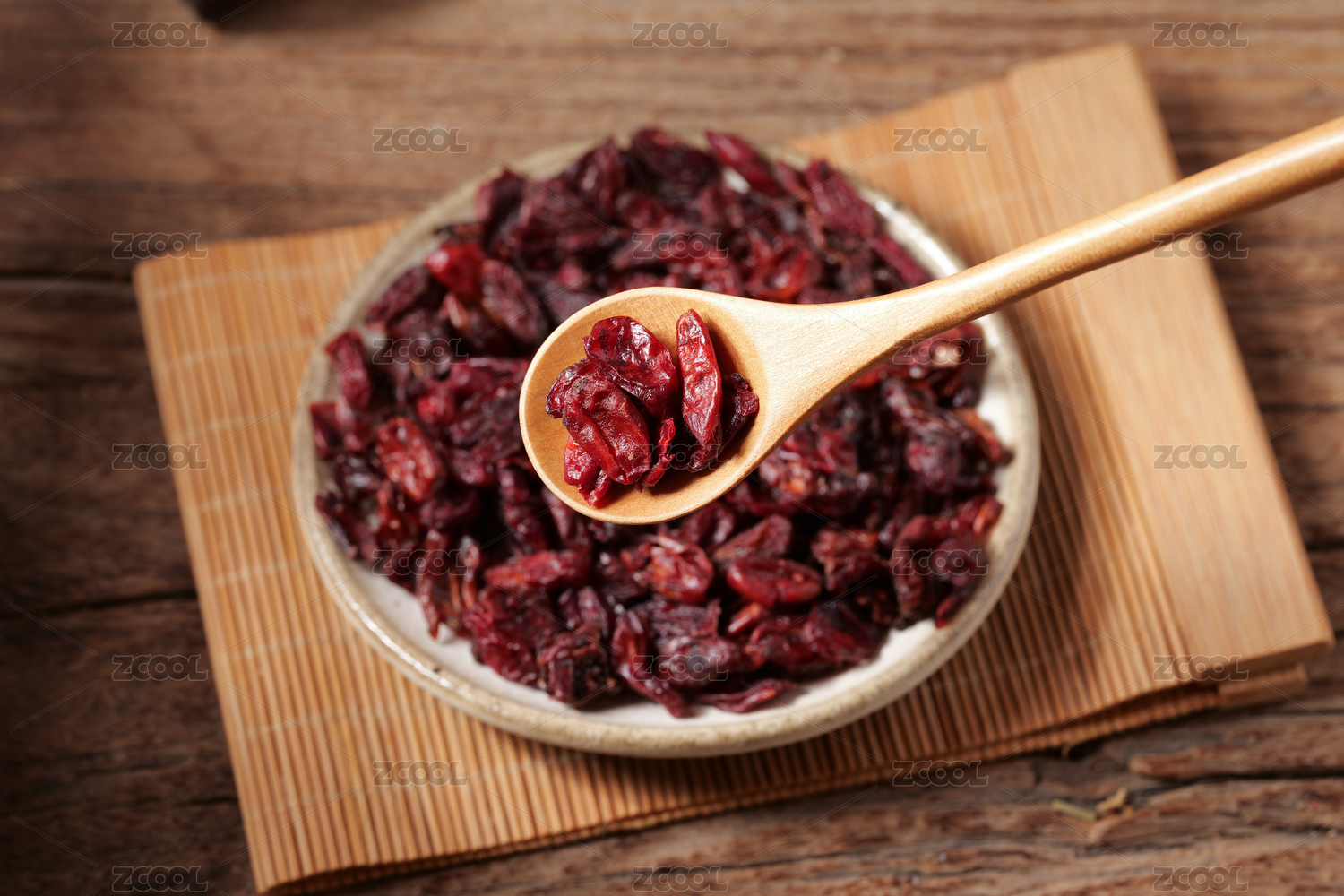 桌面上的盤子里的干爽的山茱萸