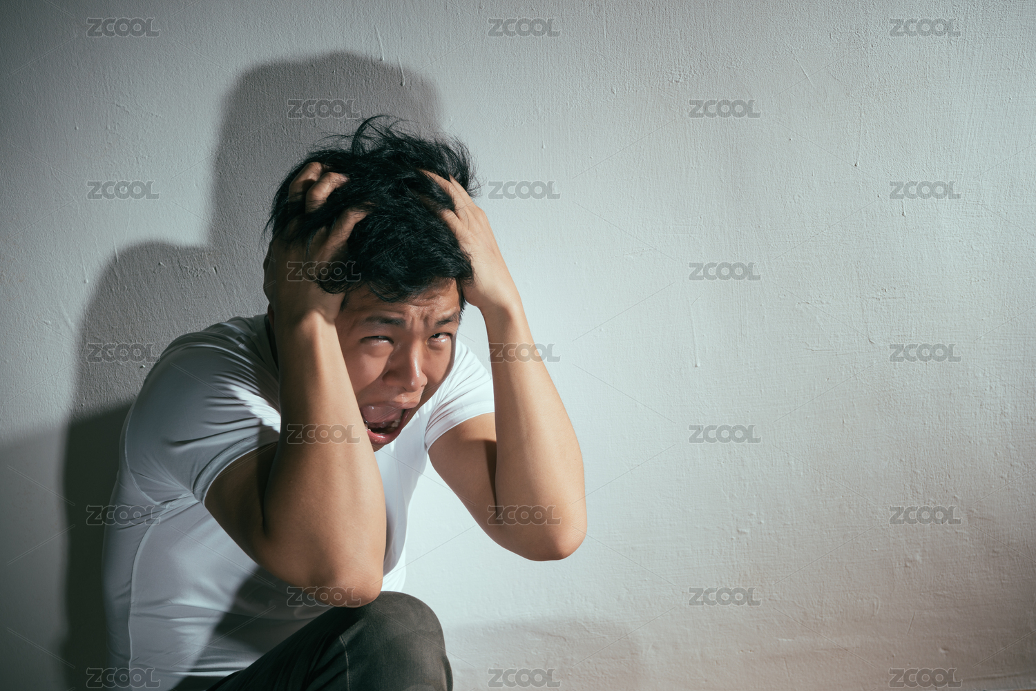 有自閉癥智障坐在木地板上哭的感覺在黑暗的悲傷與白色背景郁悶的人。
