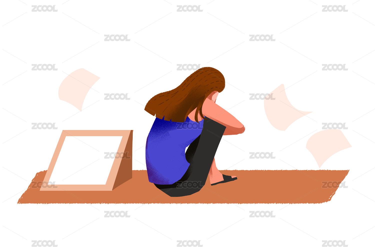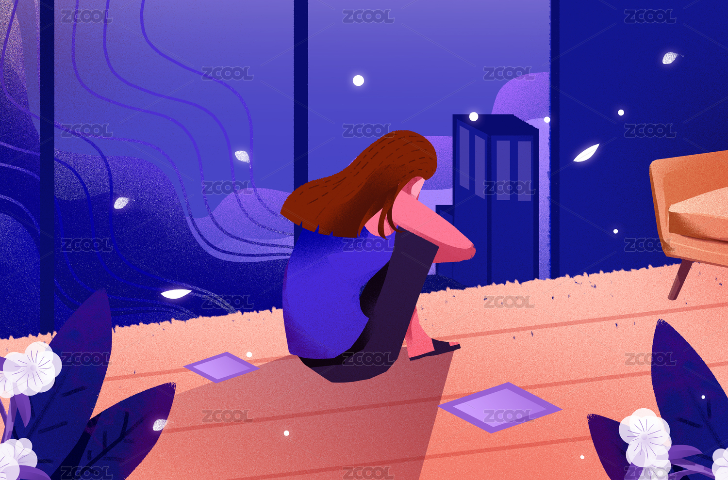 卡通手繪世界自閉日女子孤獨(dú)抱膝坐插畫