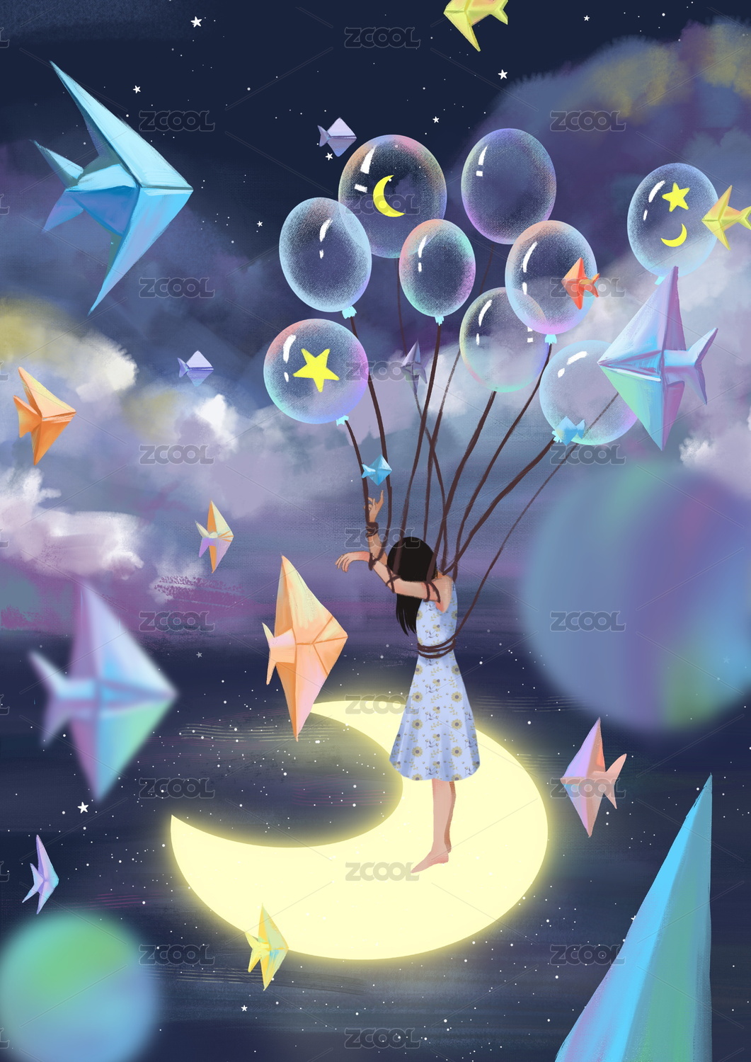 被氣球綁著站在月亮上的女孩治愈系插畫