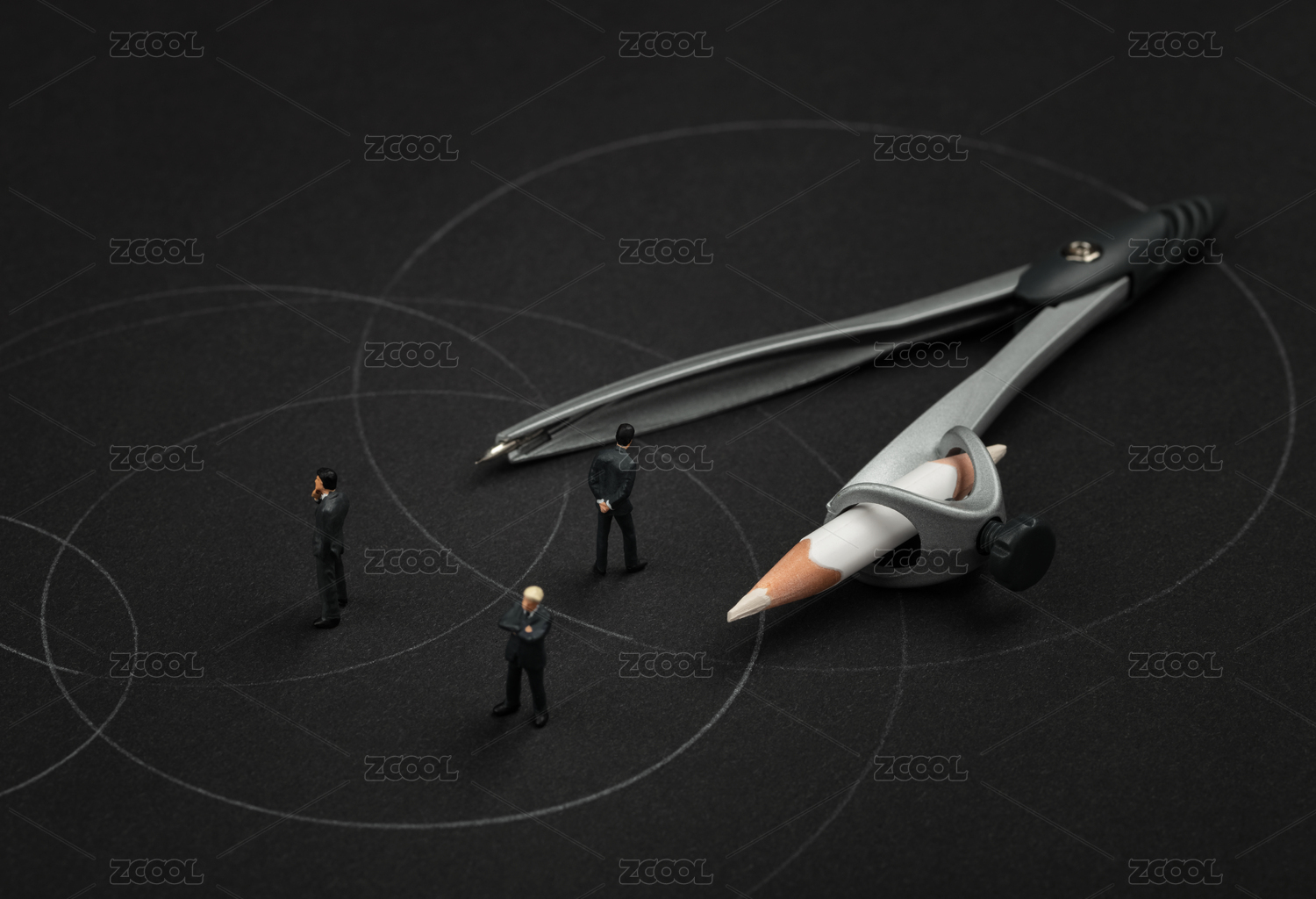 圓規(guī)畫(huà)圓圈與三個(gè)思考商務(wù)男性