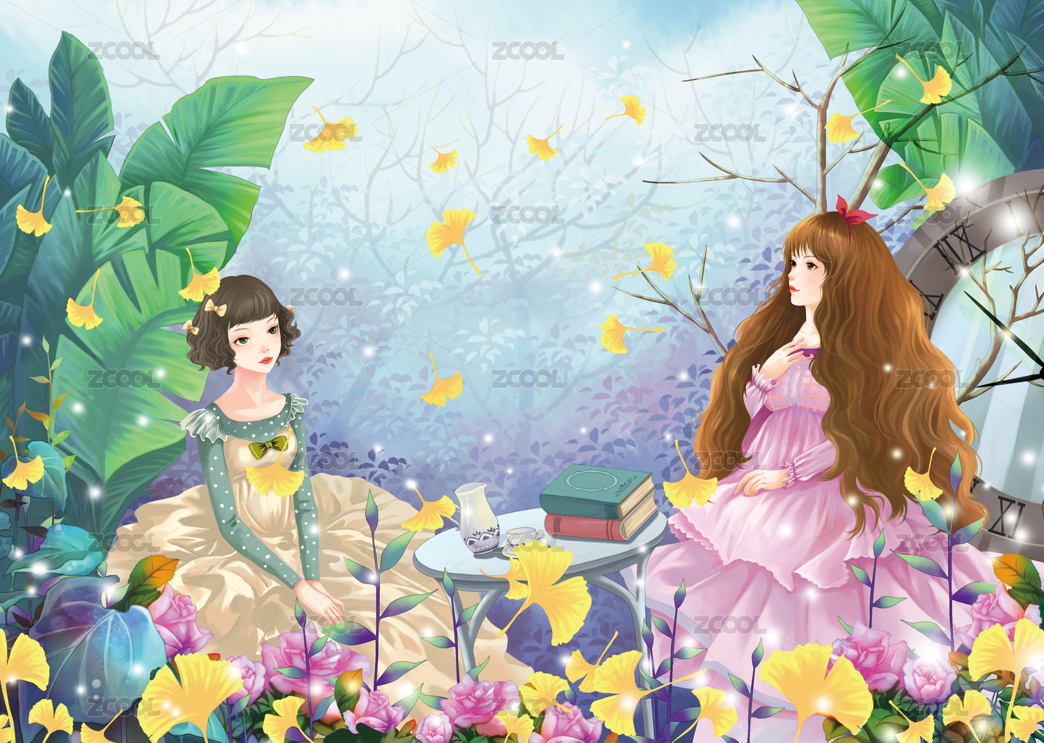 女孩的茶話會周圍飄灑著金黃色的銀杏葉
