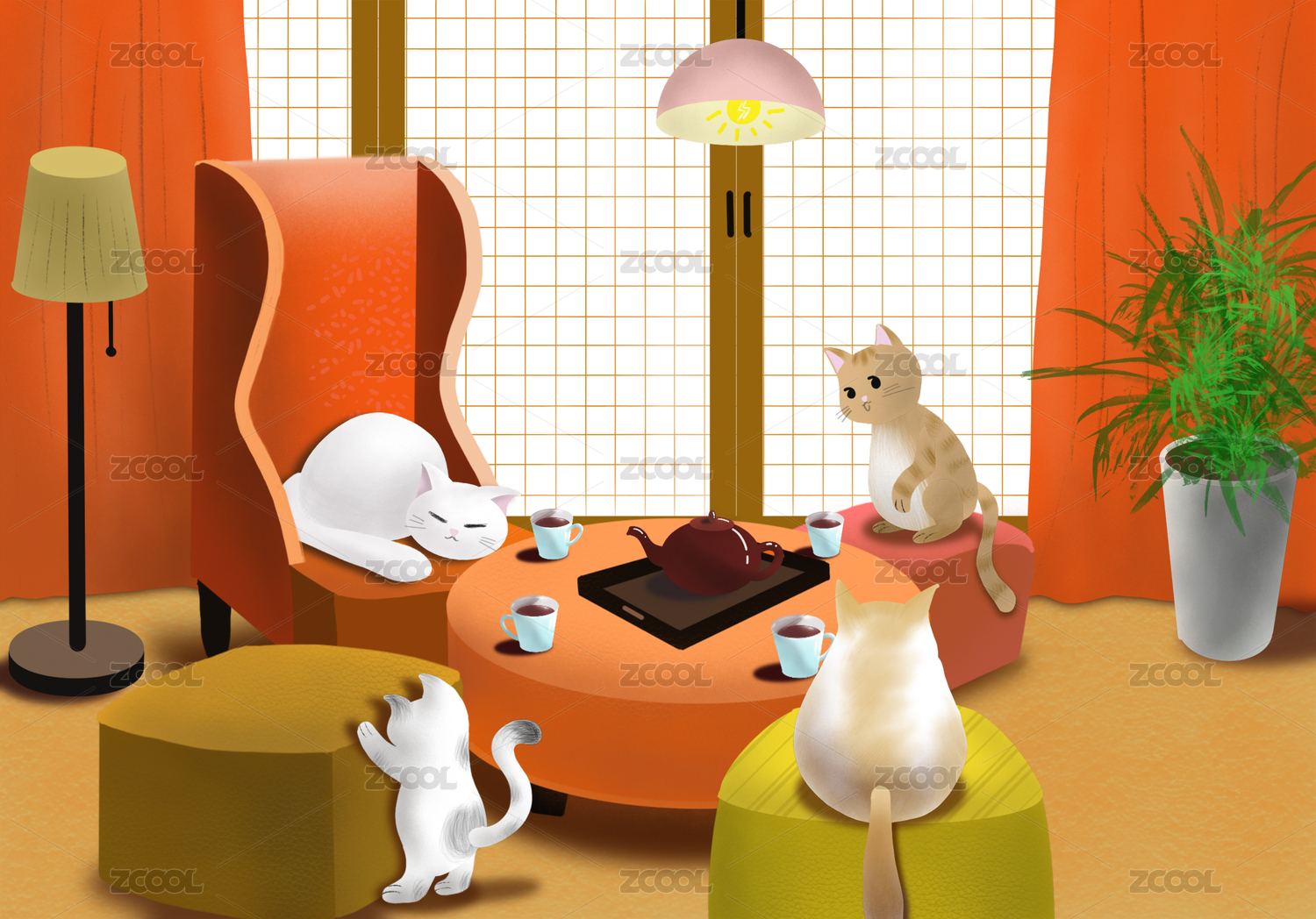四只貓咪坐在會客廳里喝茶聊天