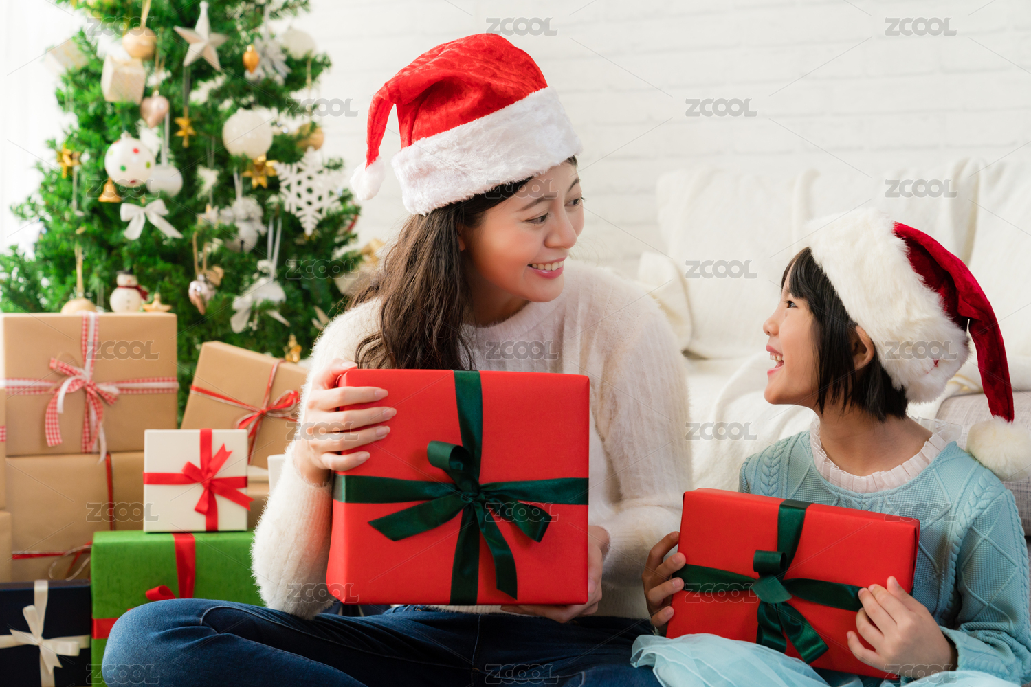 幸福的亞洲家庭的母親,在與客廳交換禮物的圣誕樹在圣誕節(jié)早晨孩子的女兒。
