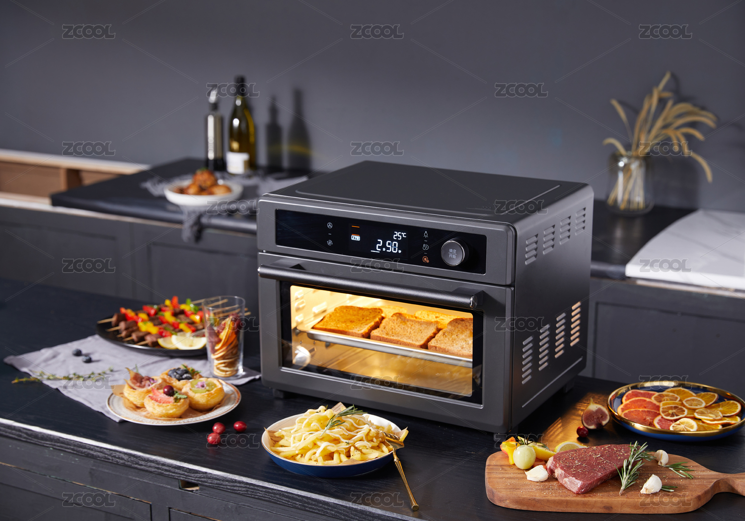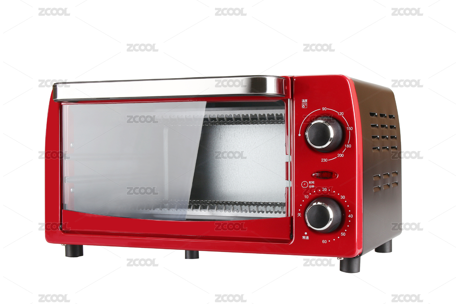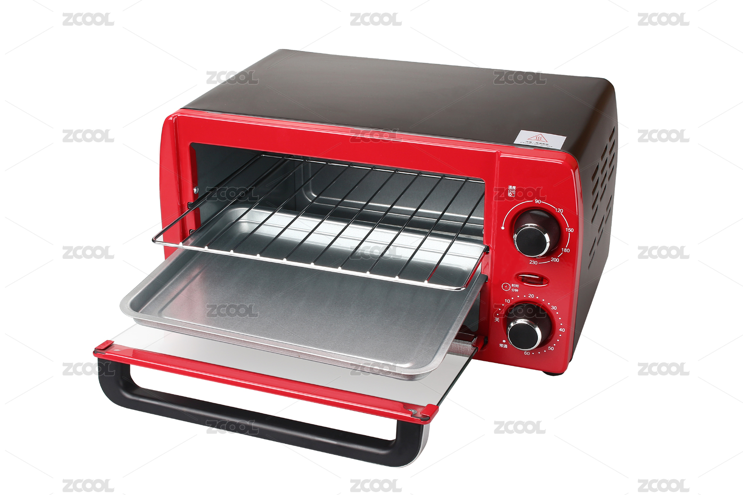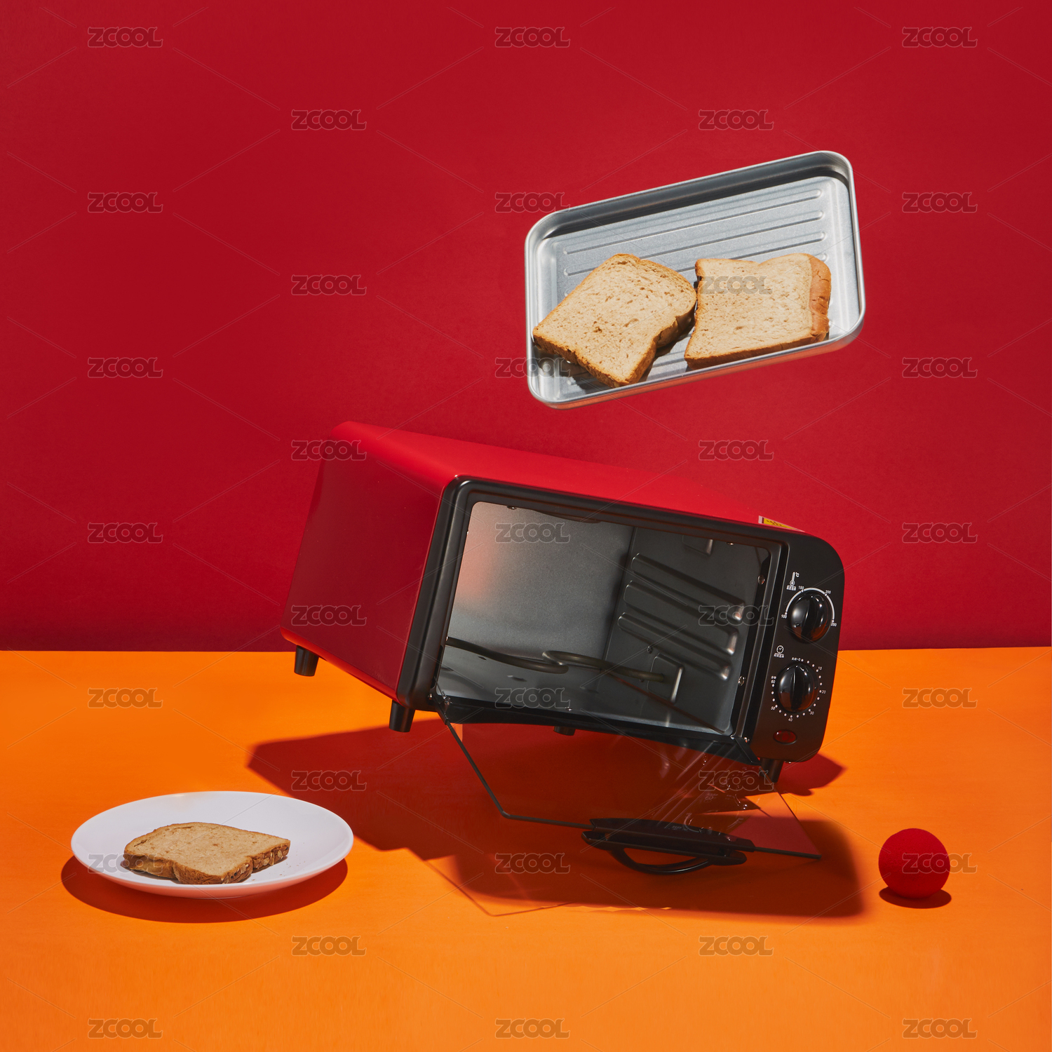 紅橙色背景白色盤子和騰空漂浮的烤箱和面包片