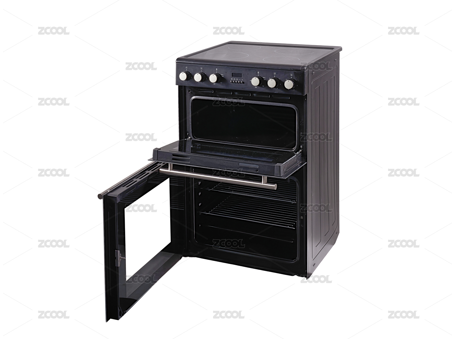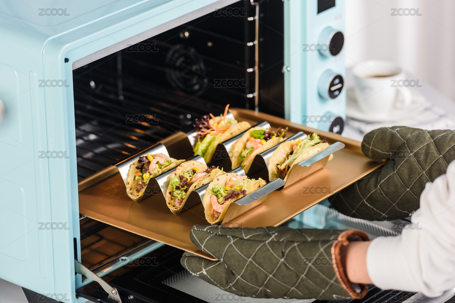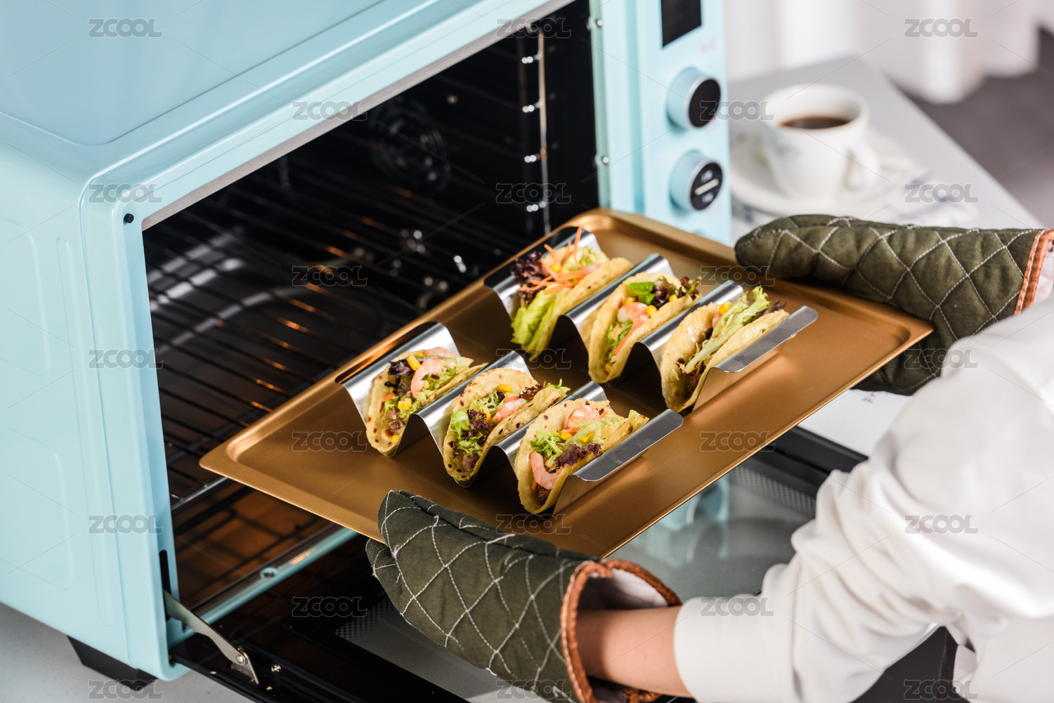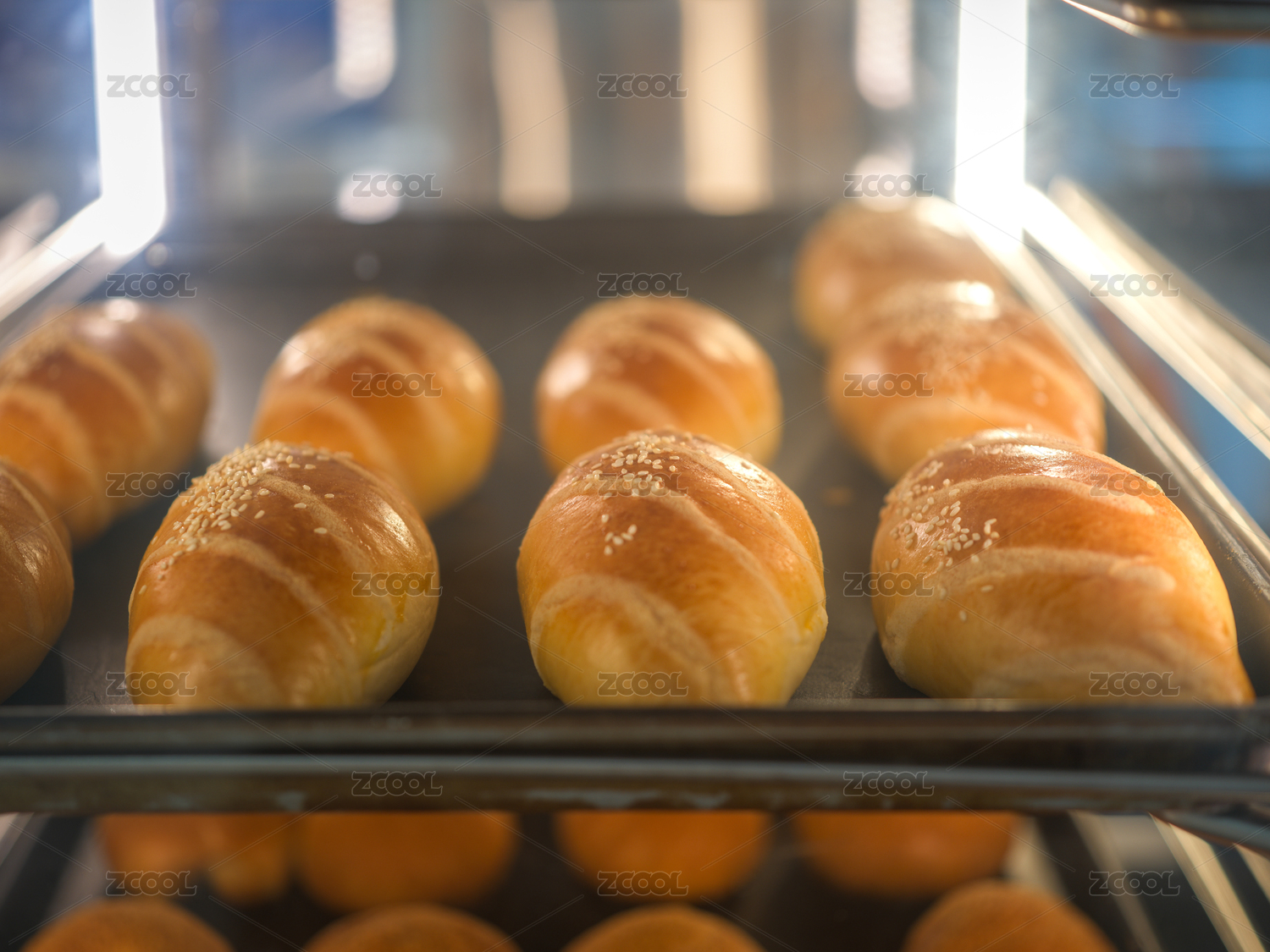 紅橙色背景白色盤子和騰空漂浮的烤箱和面包片