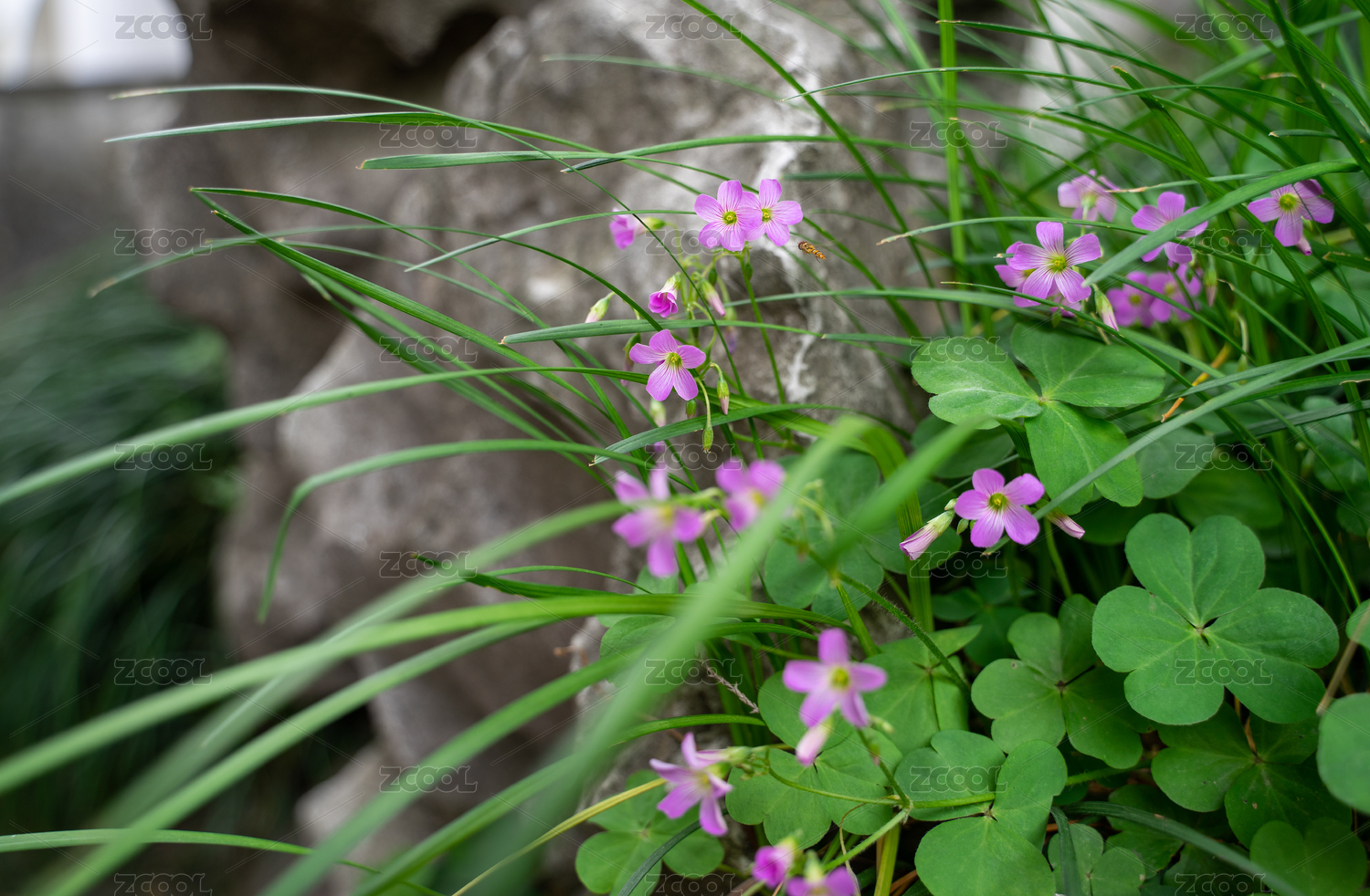 初夏公園墻角盛開的紫色小花