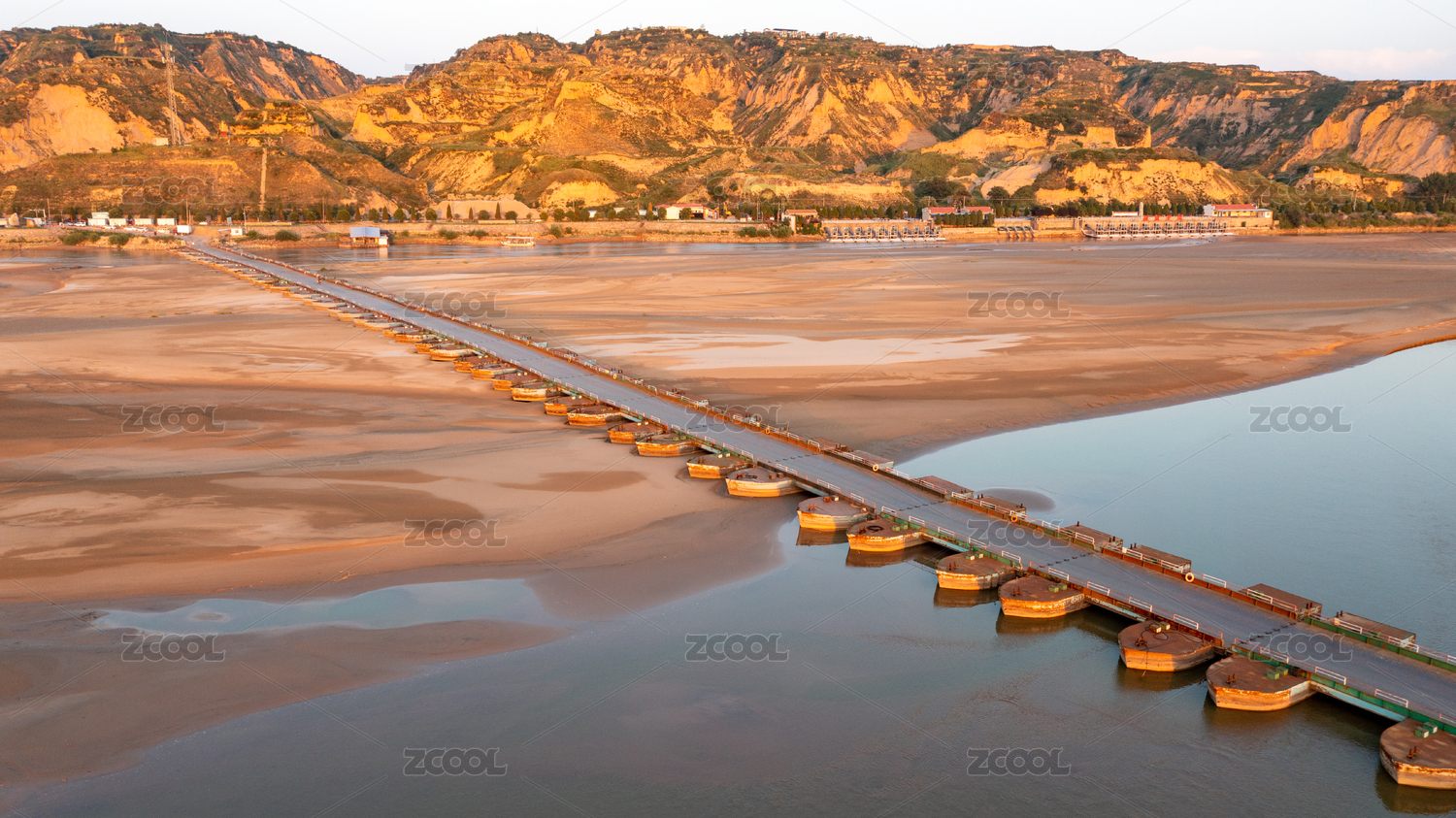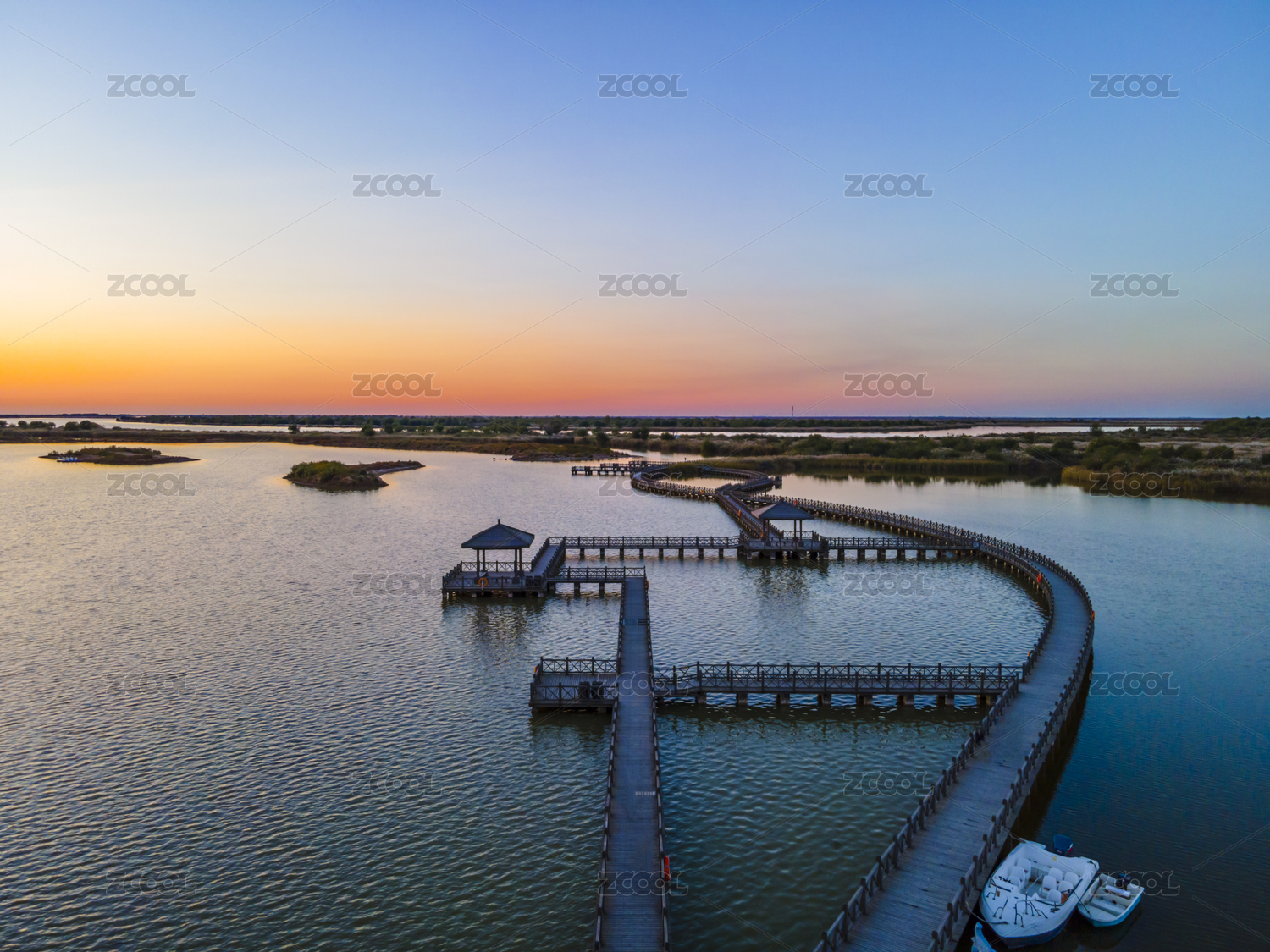山東東營黃河入海口夕陽余暉下的木筏小橋