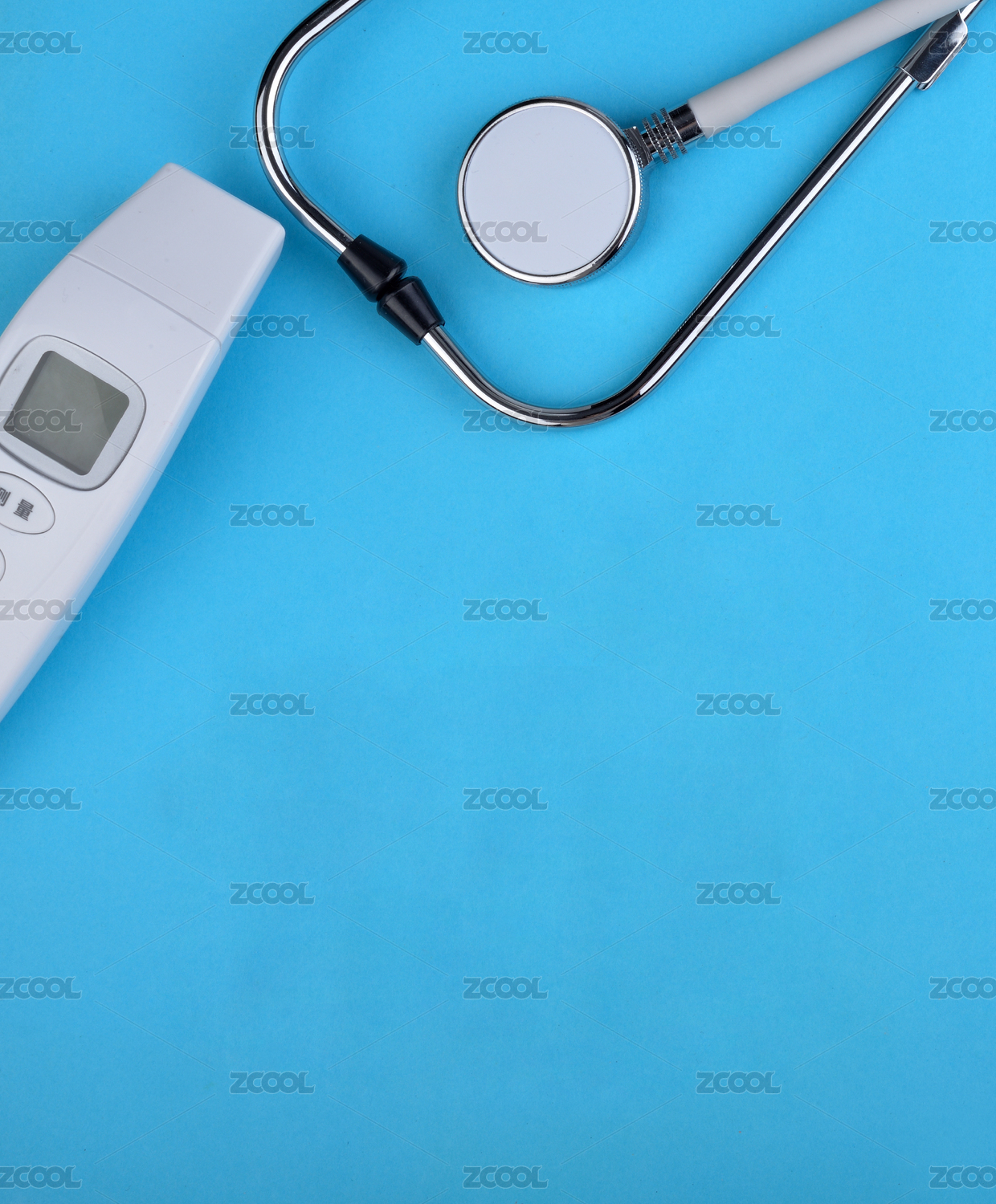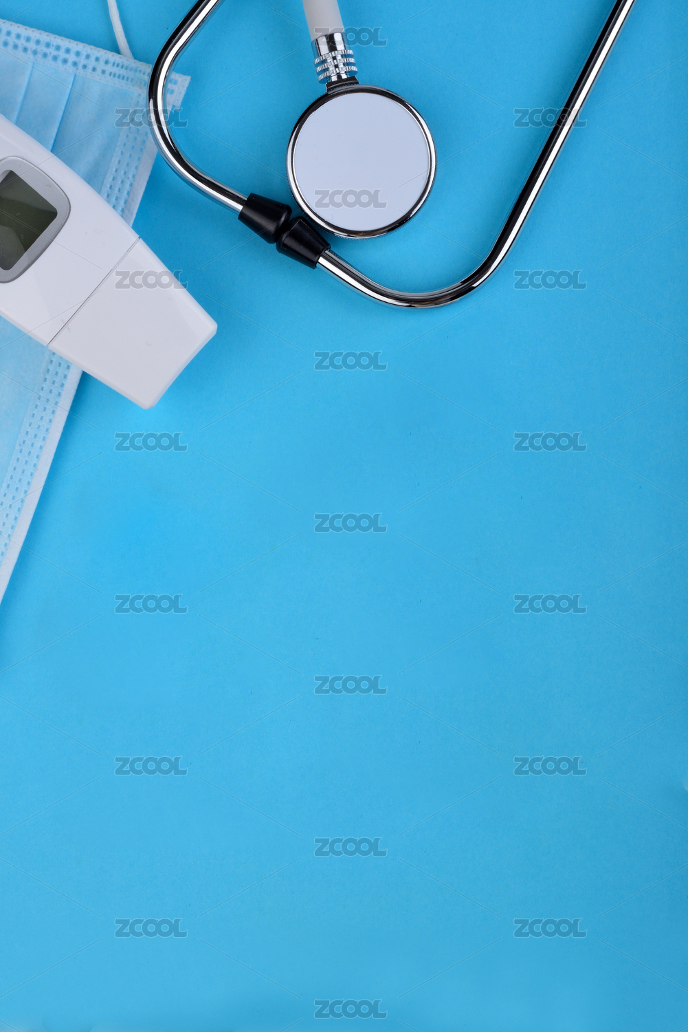 俯視藍(lán)色背景上的口罩、電子額溫槍及聽診器