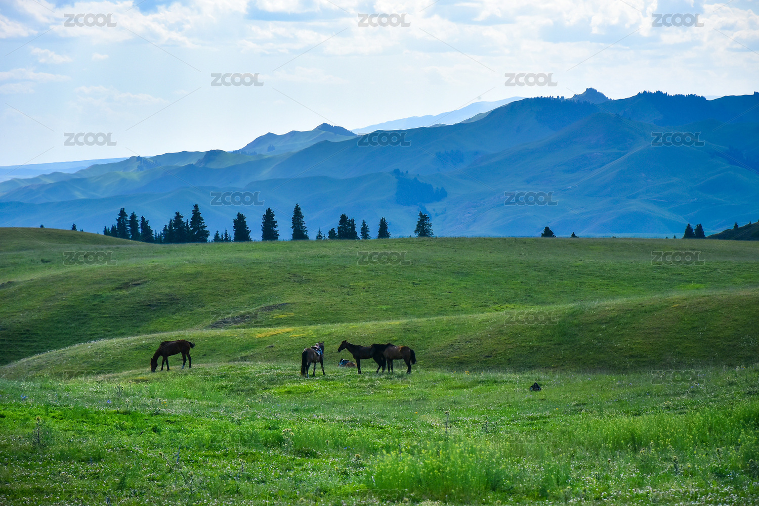 中國(guó)新疆伊犁阿克塔斯草原上的馬場(chǎng)