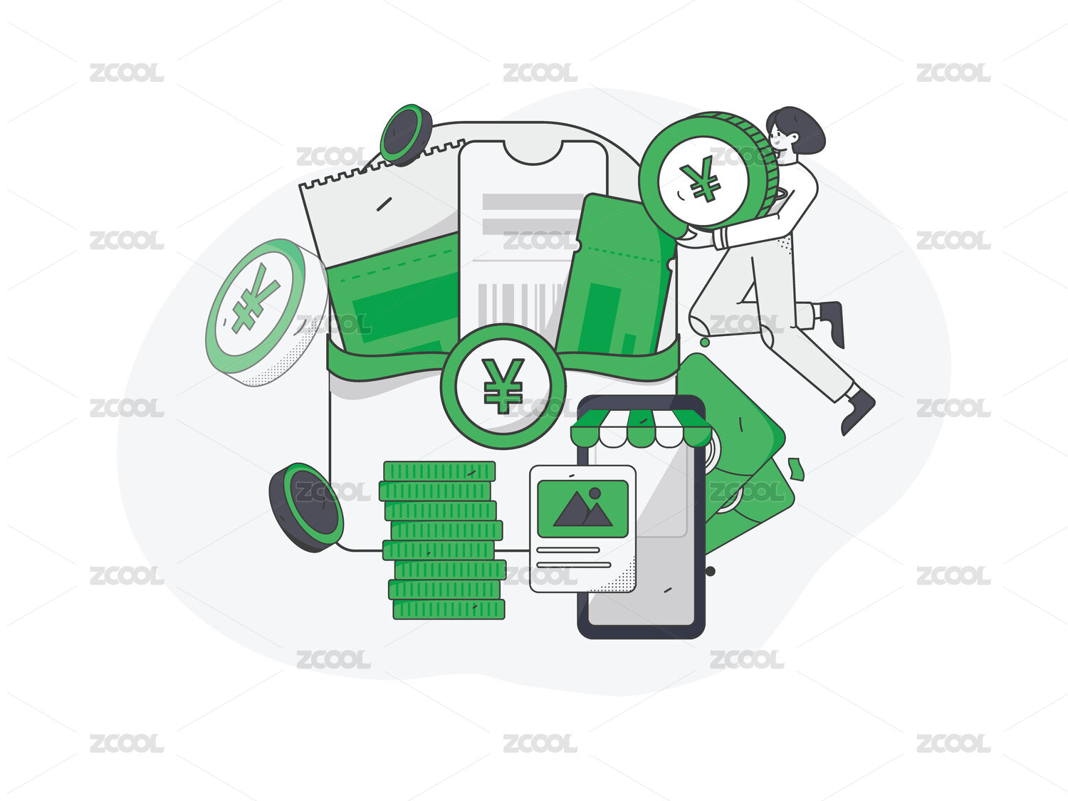 綠色描邊風(fēng)金融插畫矢量金幣紅包卡券