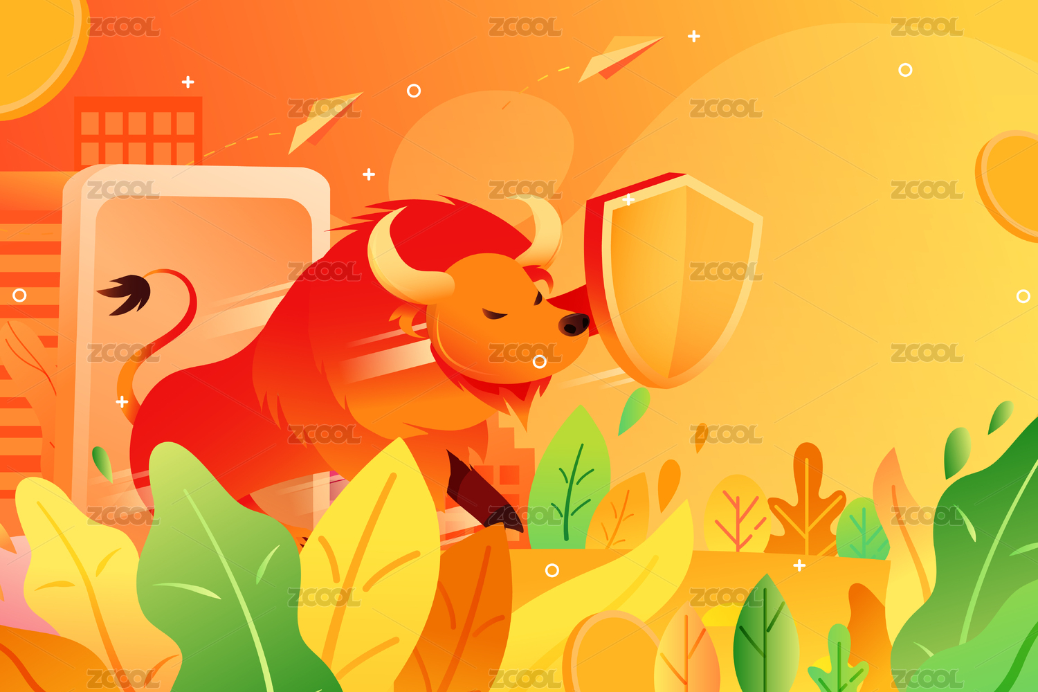 卡通盾牌保護牛市金融概念背景矢量插畫