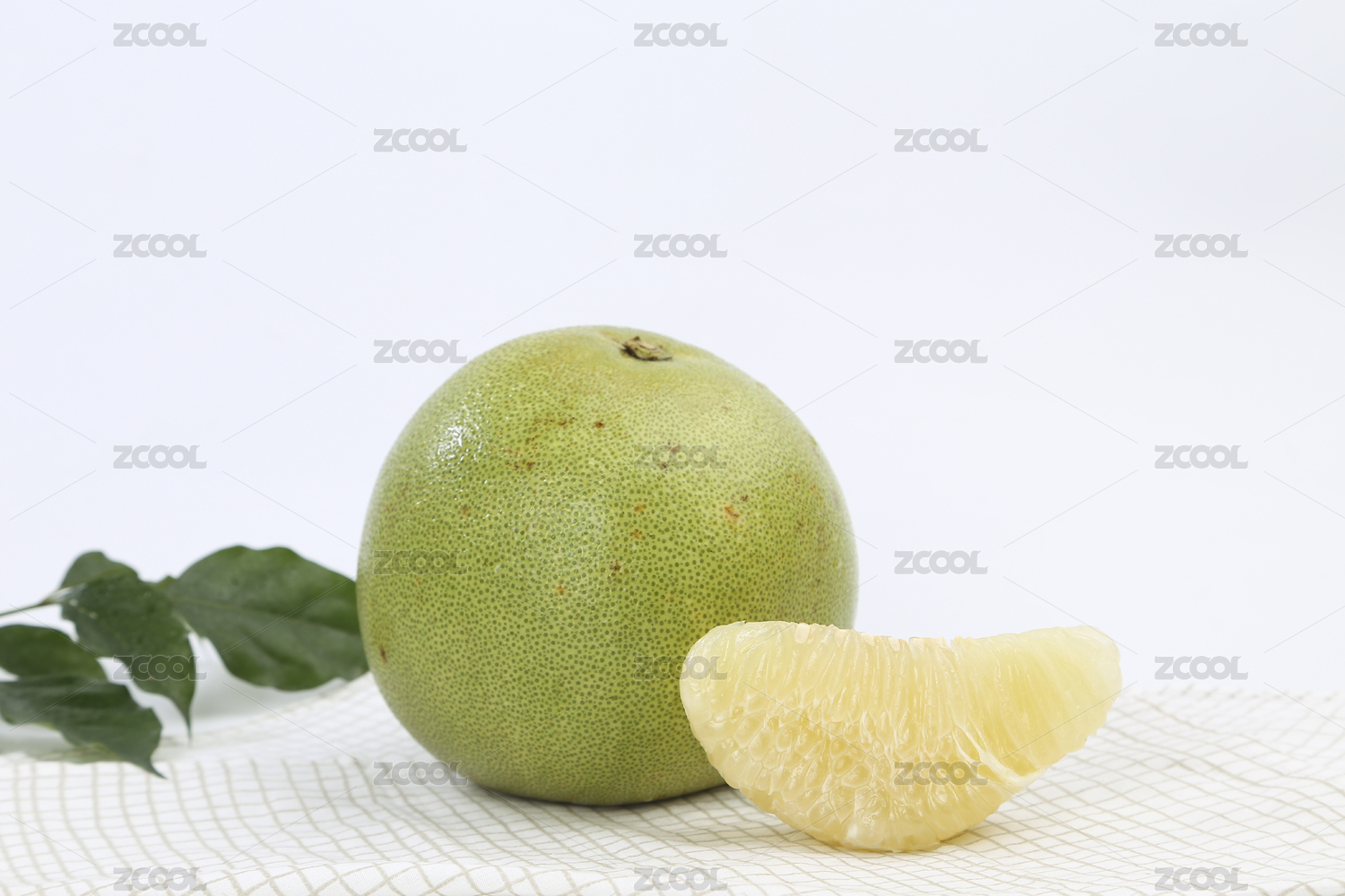 切開(kāi)放在白色背景板上的新鮮多汁綠色青柚