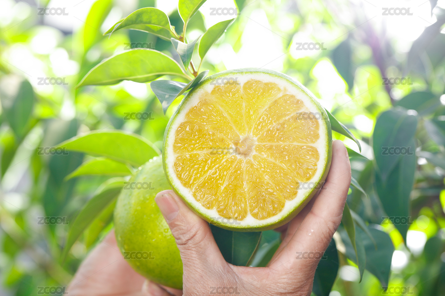 淺藍(lán)底上盤(pán)子里放著青柚和手上拿著半邊西柚
