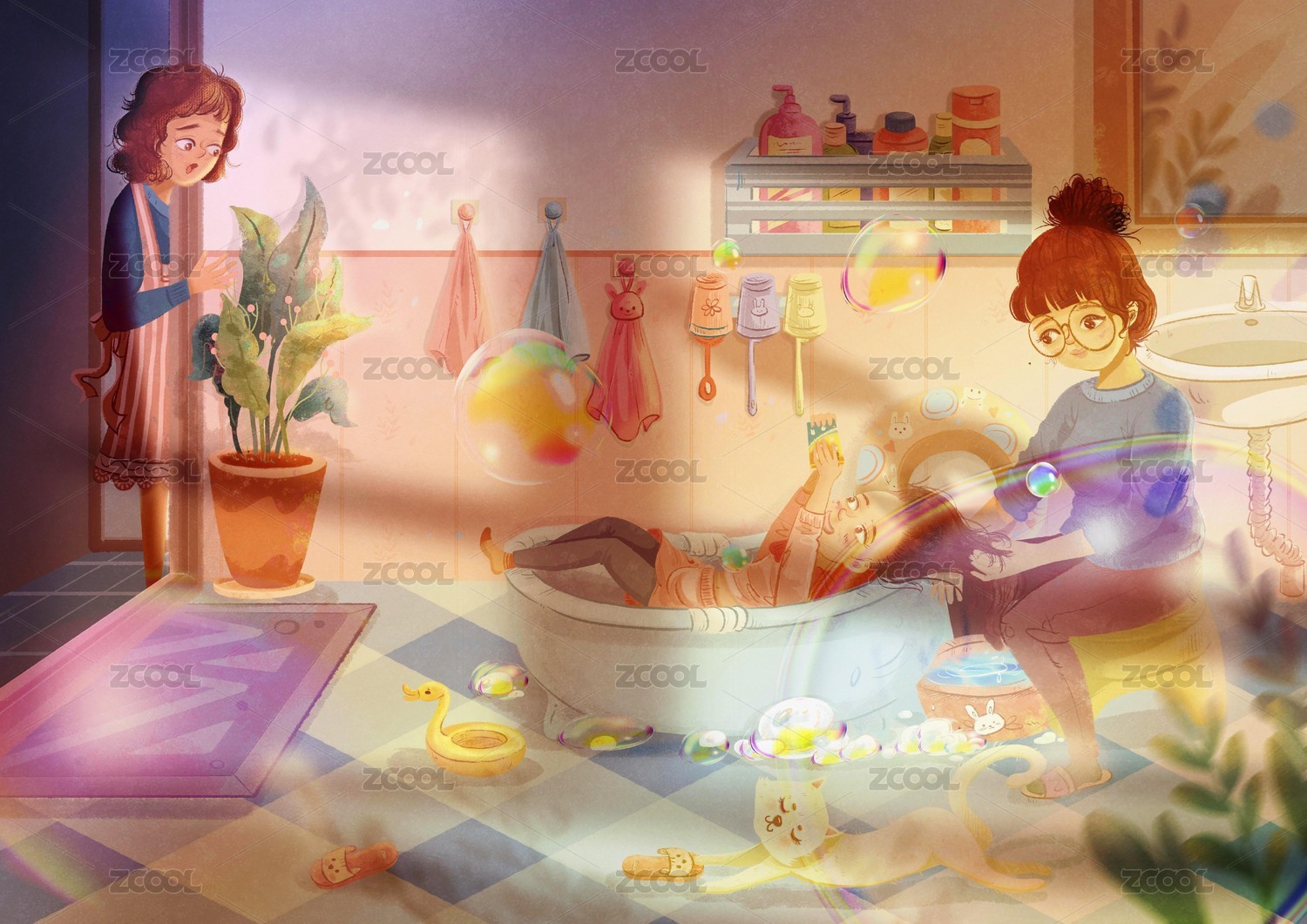 洗頭發(fā)美發(fā)做頭發(fā)卷發(fā)梳頭卡通少女插圖