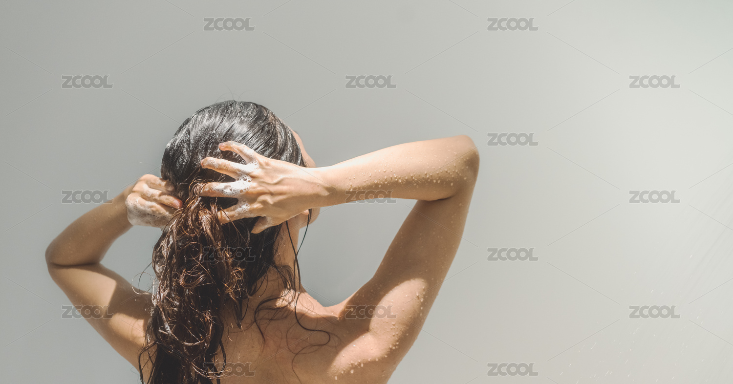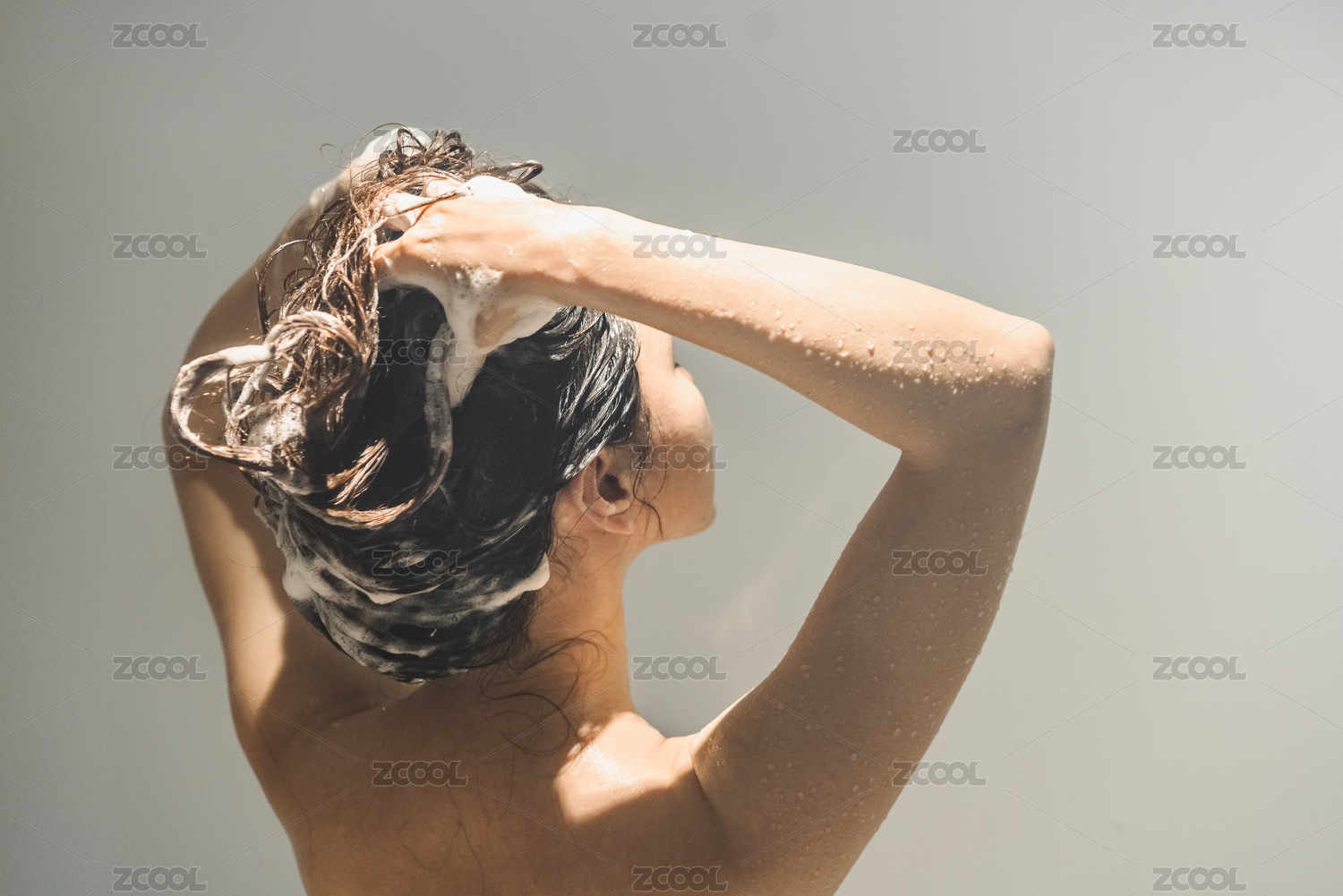 正在浴室中用水沖洗頭發(fā)的男士背面