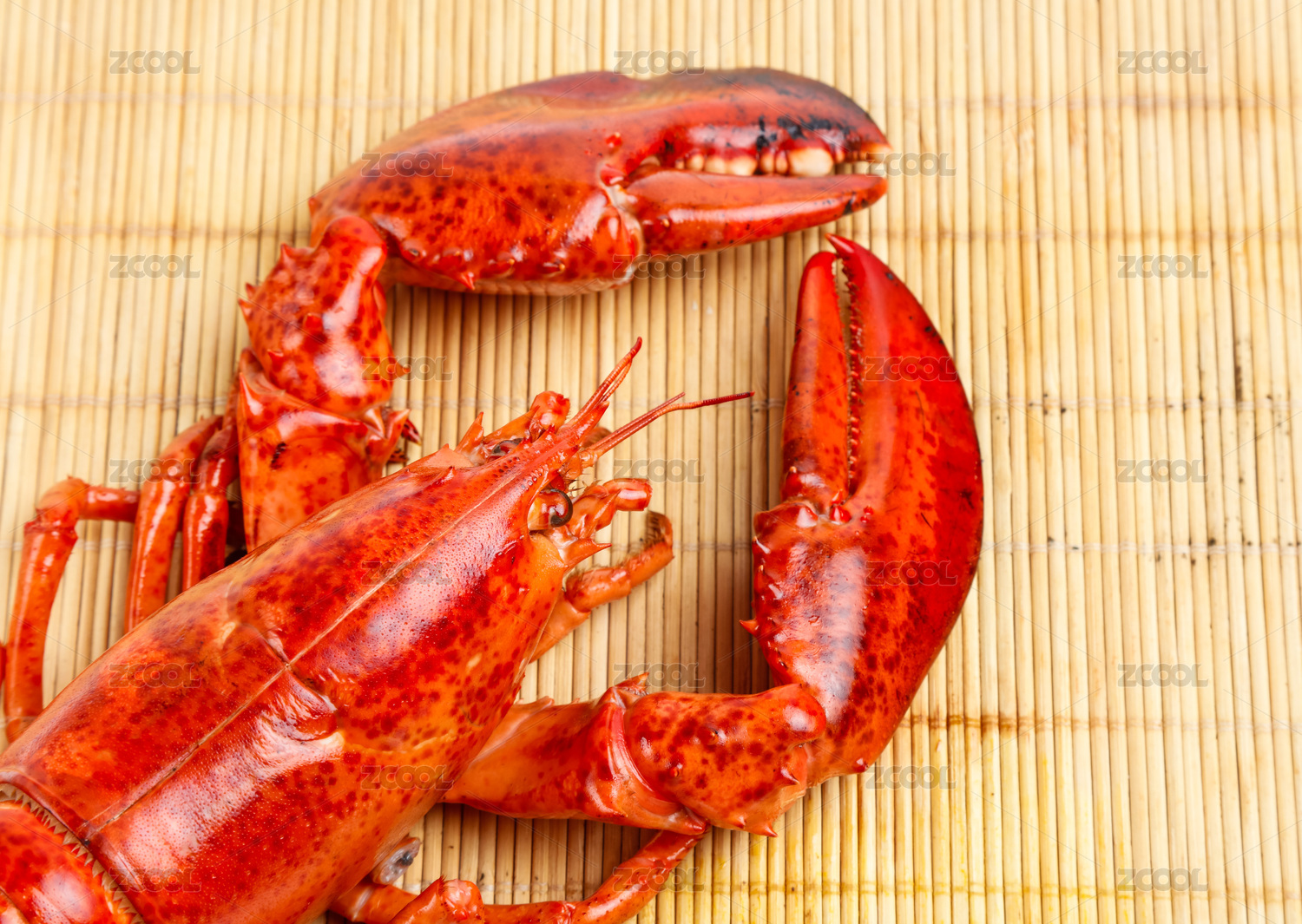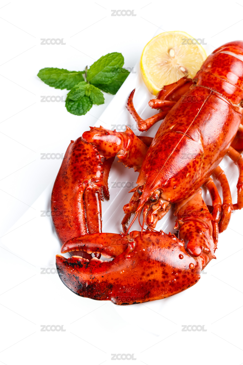 白底上放著一只蒸熟的大龍蝦