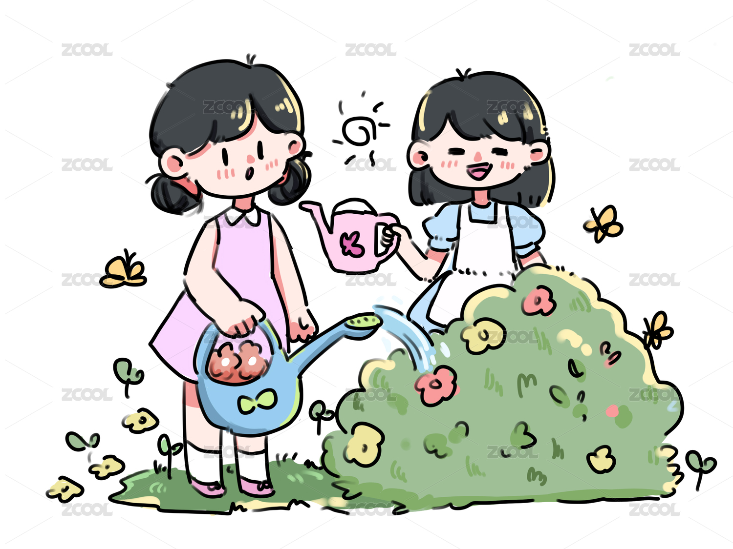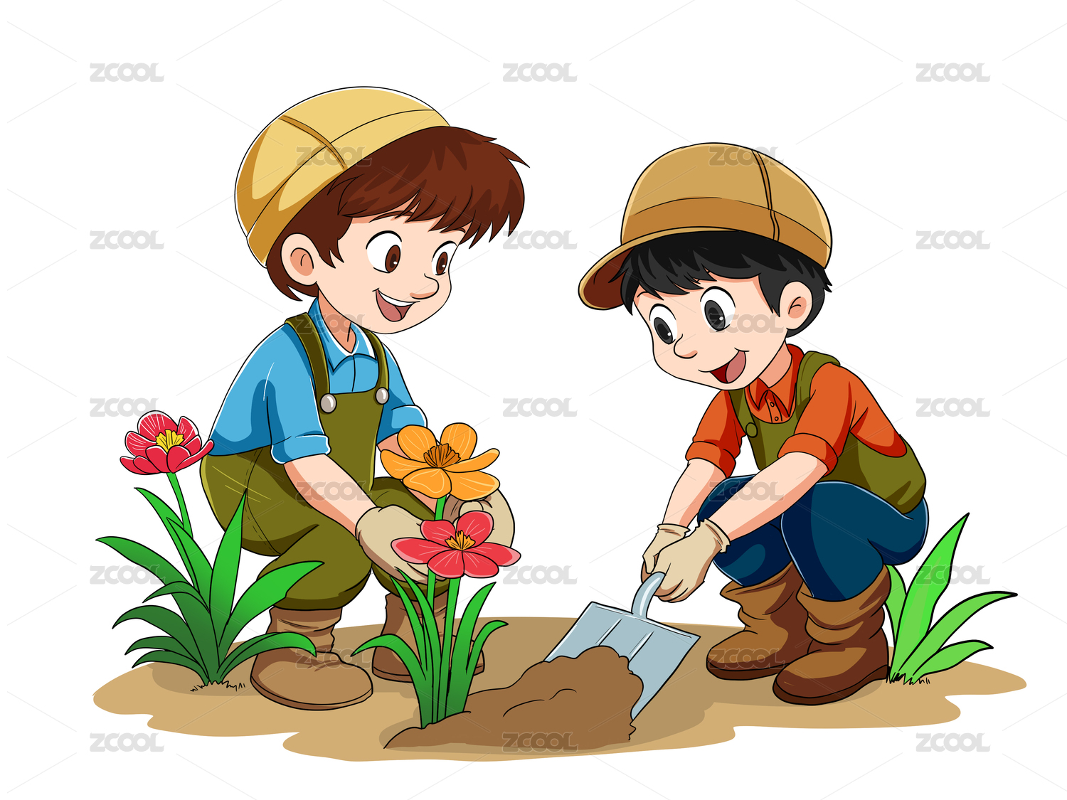 雙人男孩園丁在澆花呵護(hù)花朵卡通漫畫元素