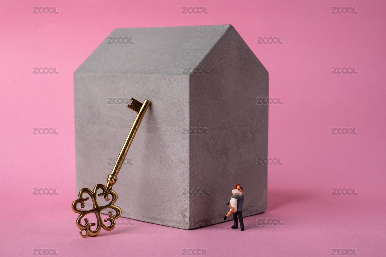 一對(duì)相擁的戀人站在房子和鑰匙邊微縮創(chuàng)意