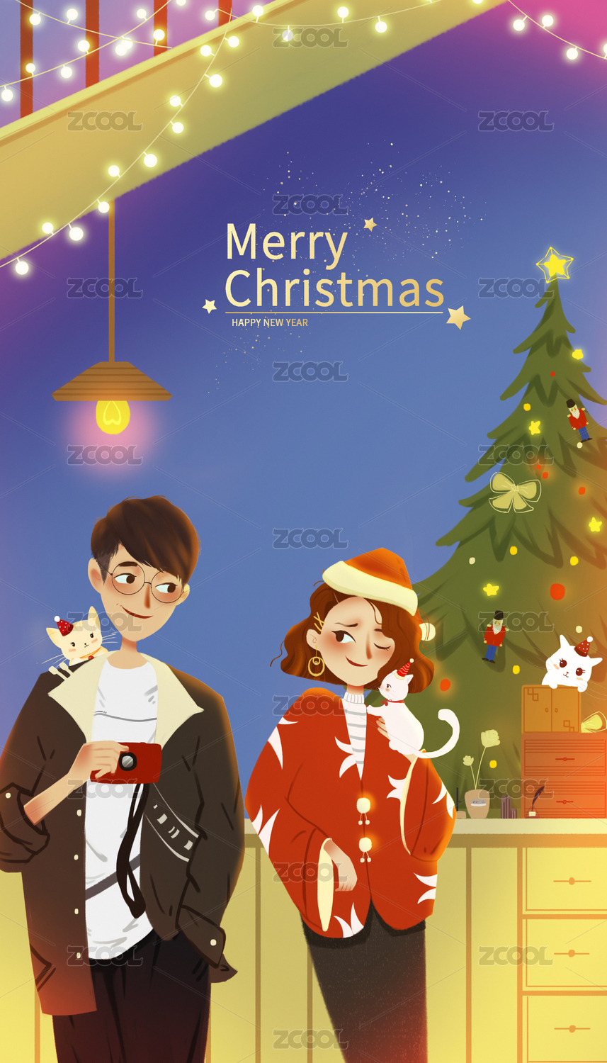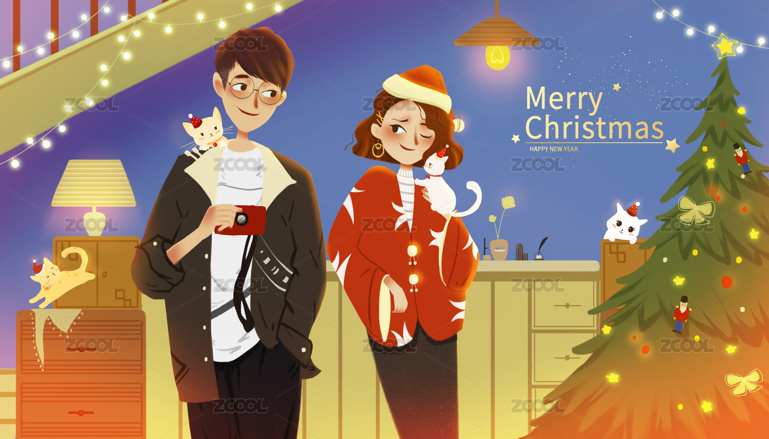 圣誕節(jié)歡樂(lè)拍照的戀人 抱著貓的女孩和拿著相機(jī)的男孩插畫(huà)