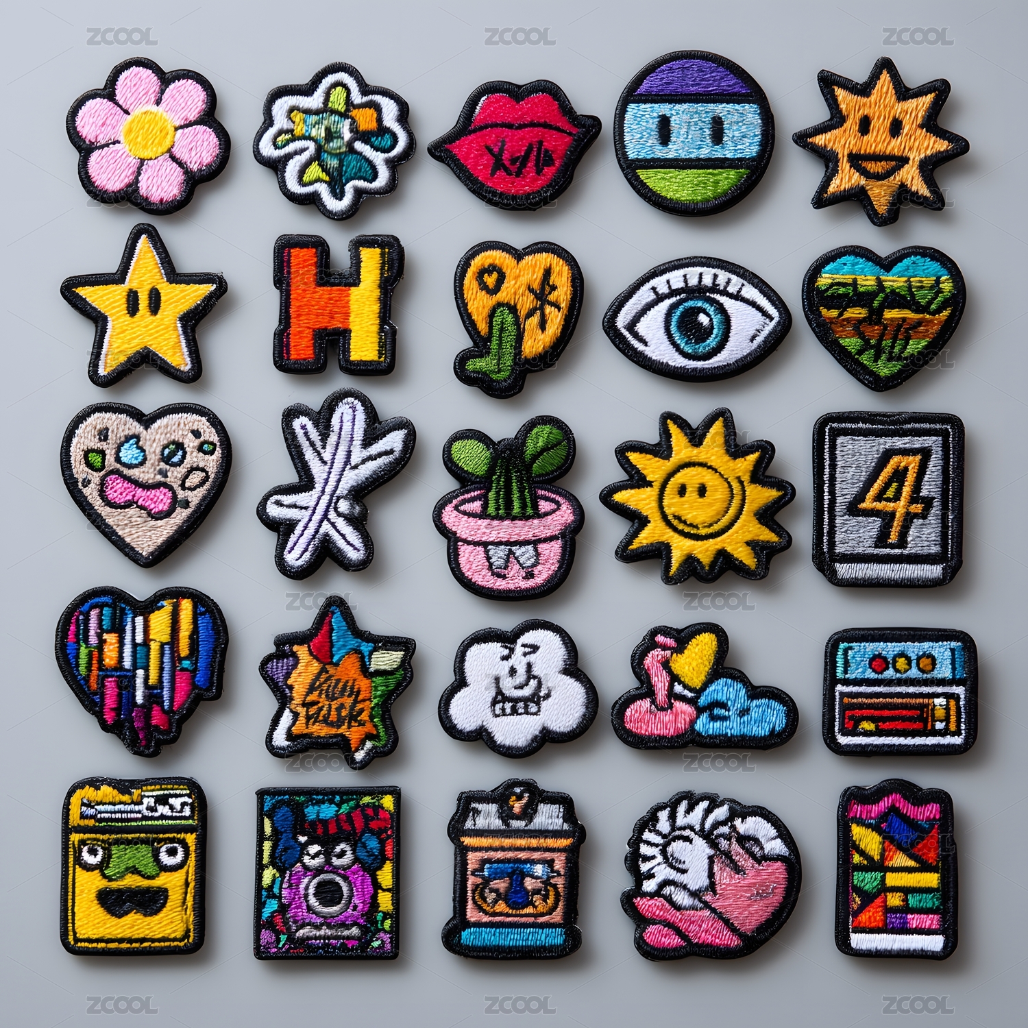 一組卡通風(fēng)格刺繡布貼平鋪排列