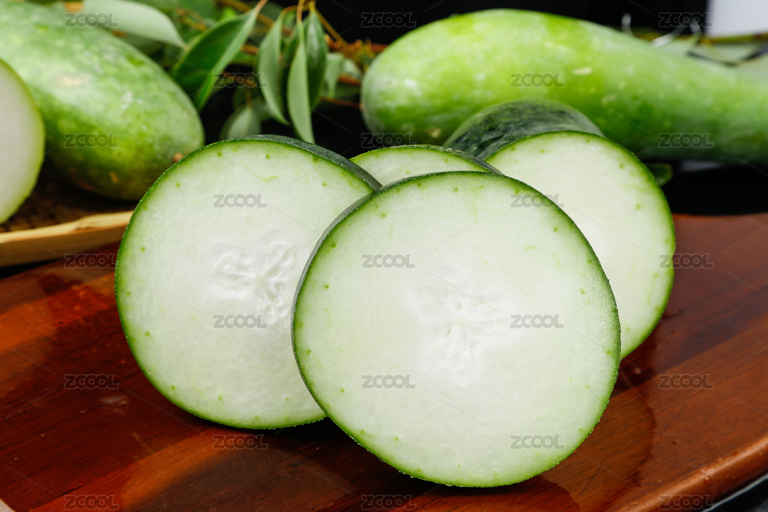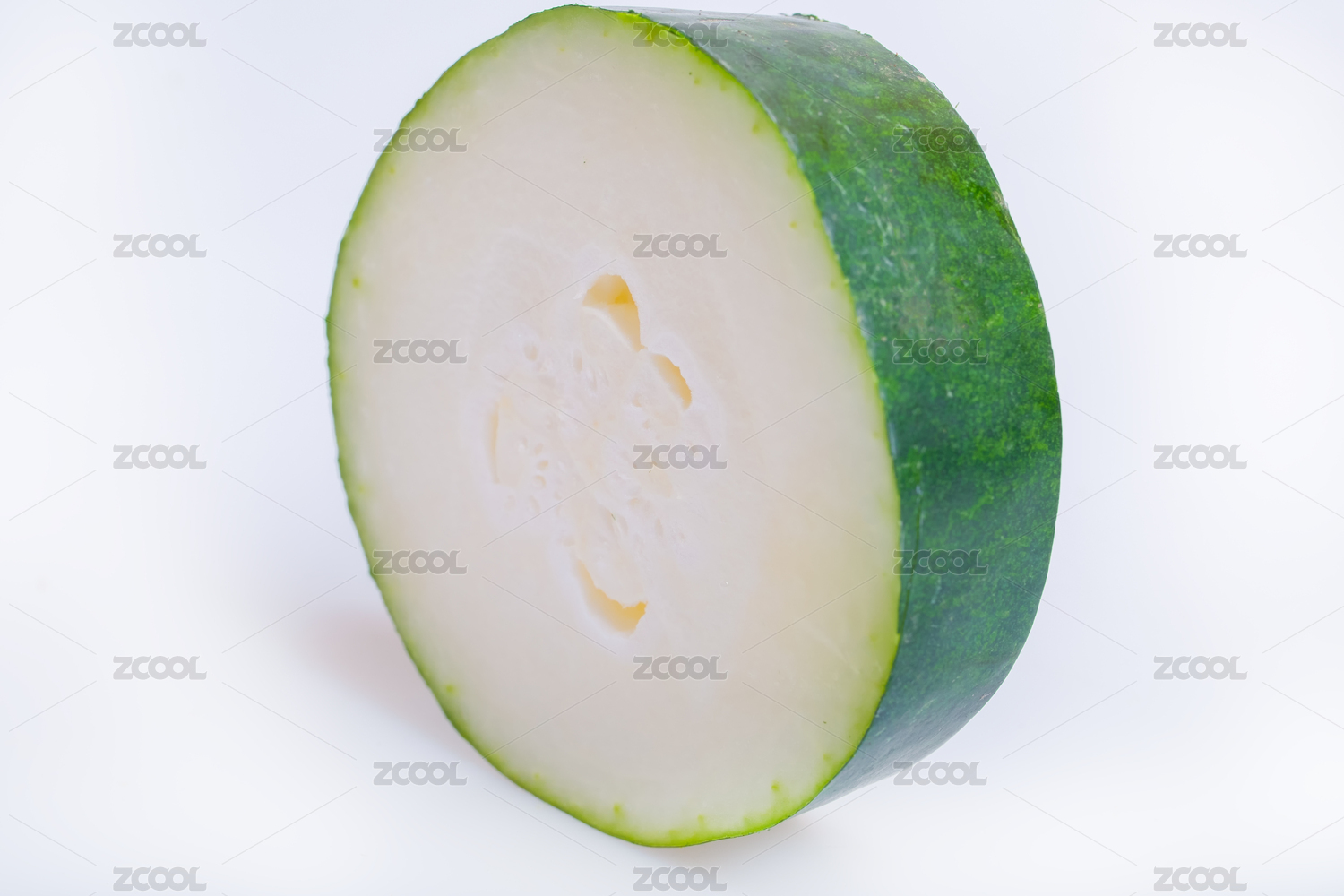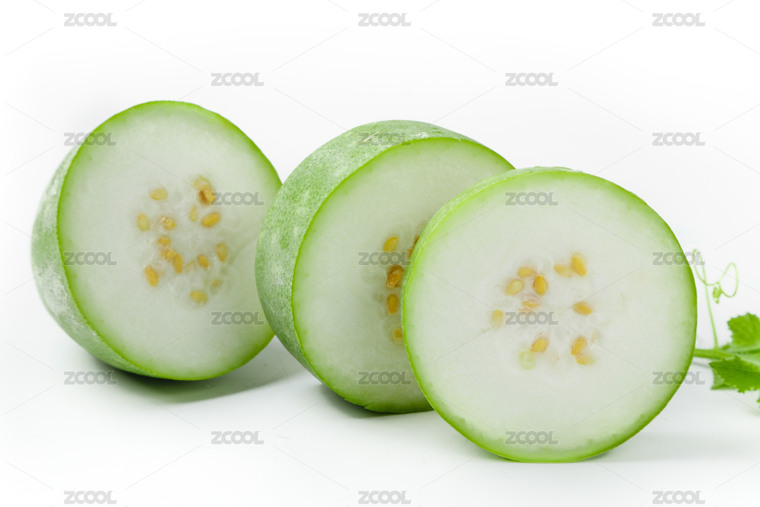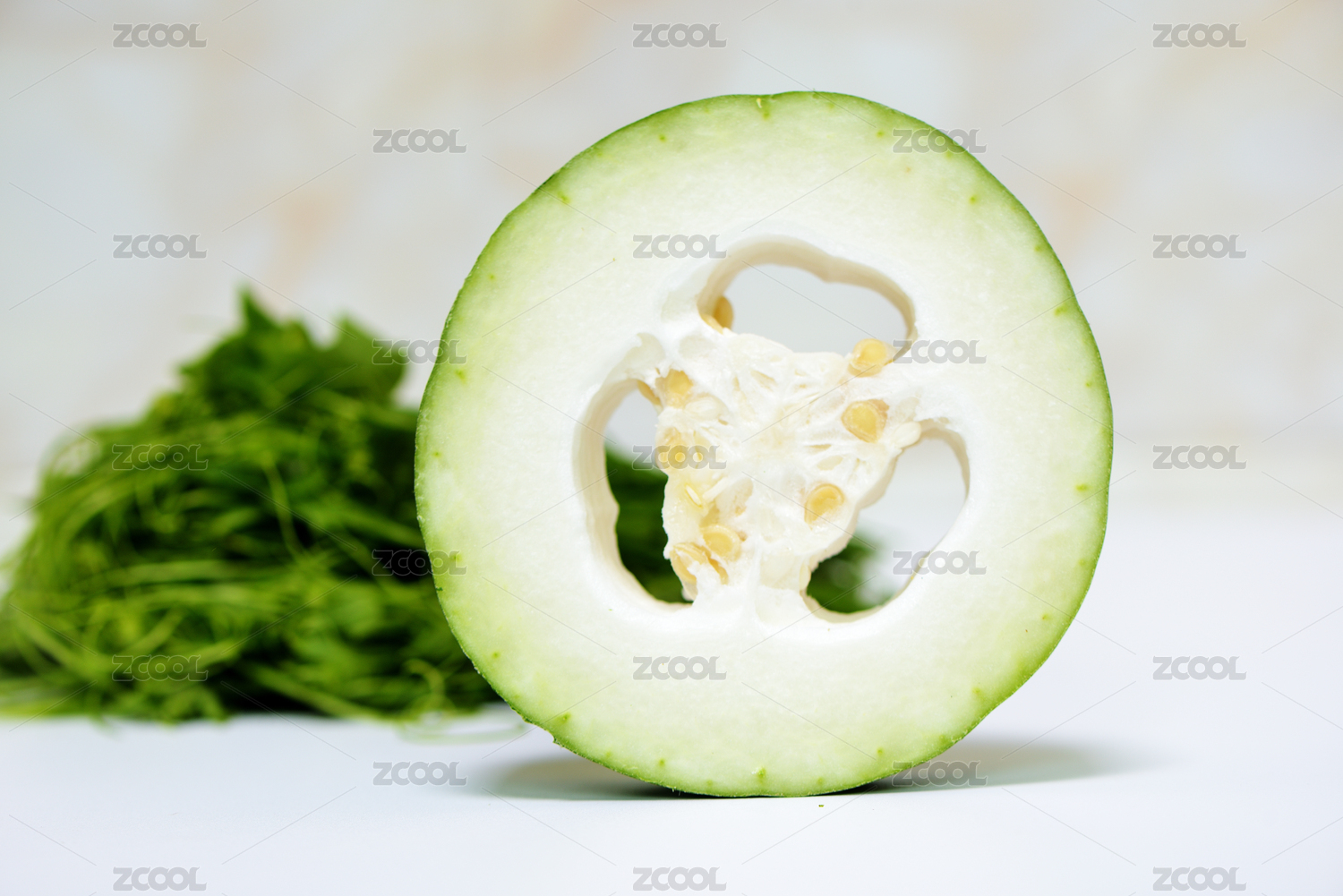 白色臺面上放著一塊切開新鮮的冬瓜和一把瓜苗菜