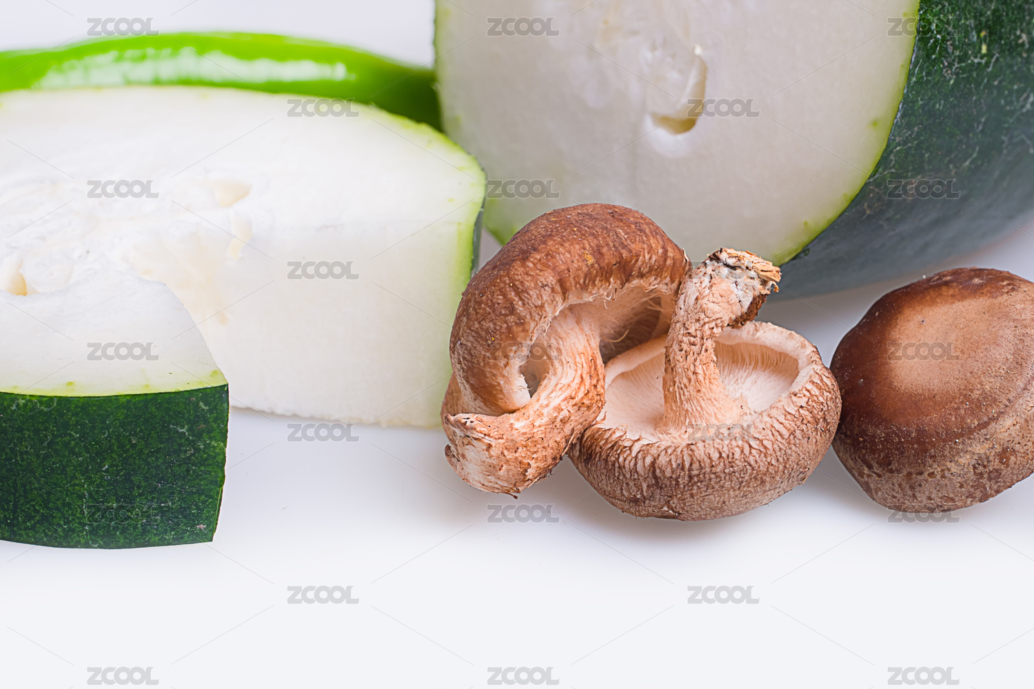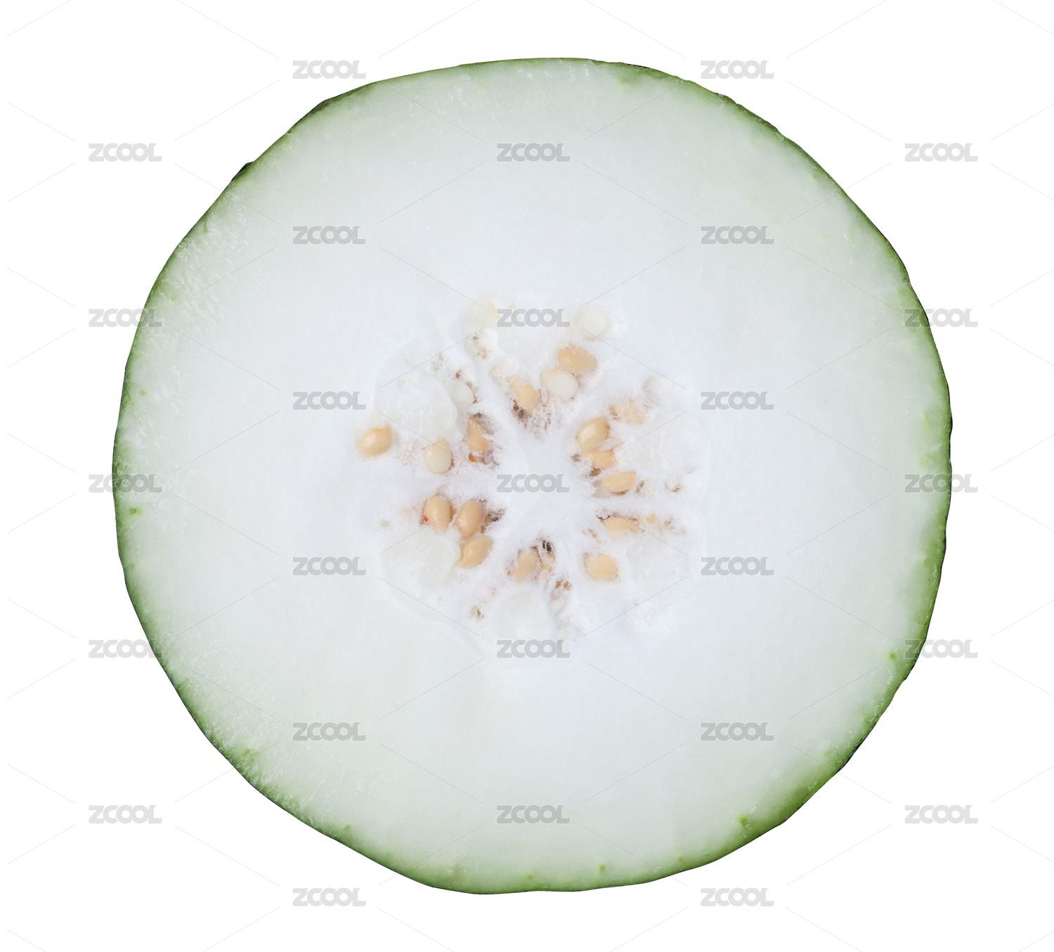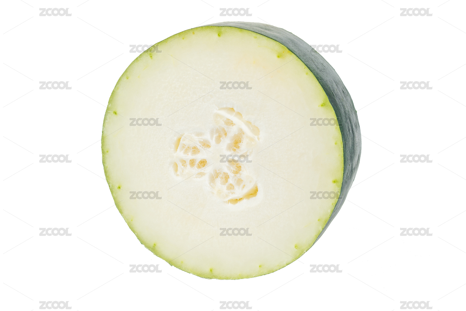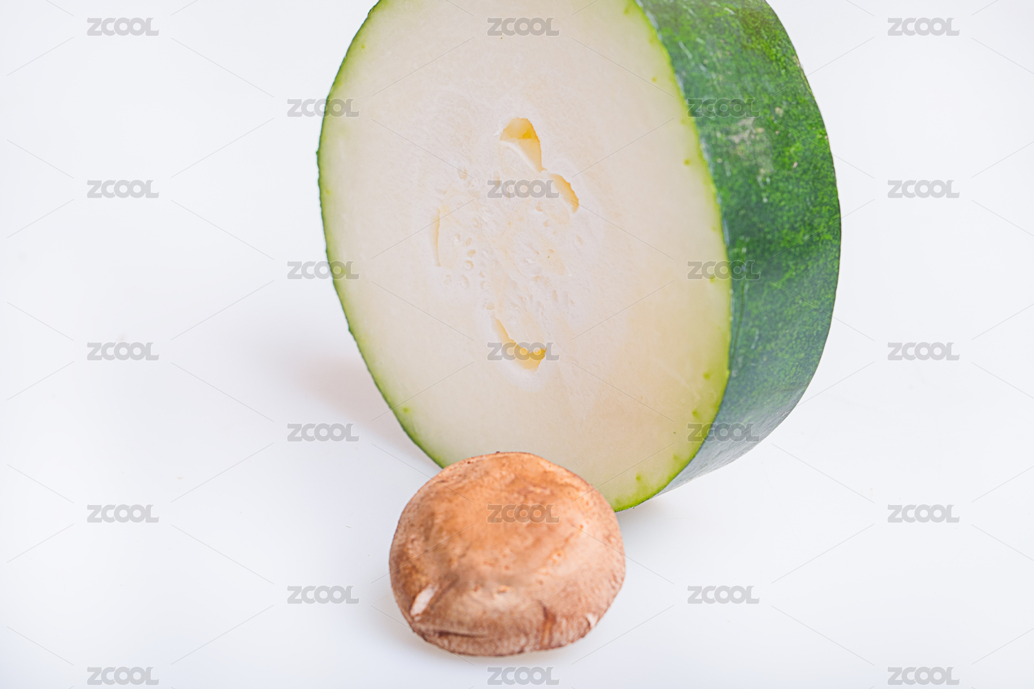 白色臺面上放著一塊切開新鮮的冬瓜和一把瓜苗菜