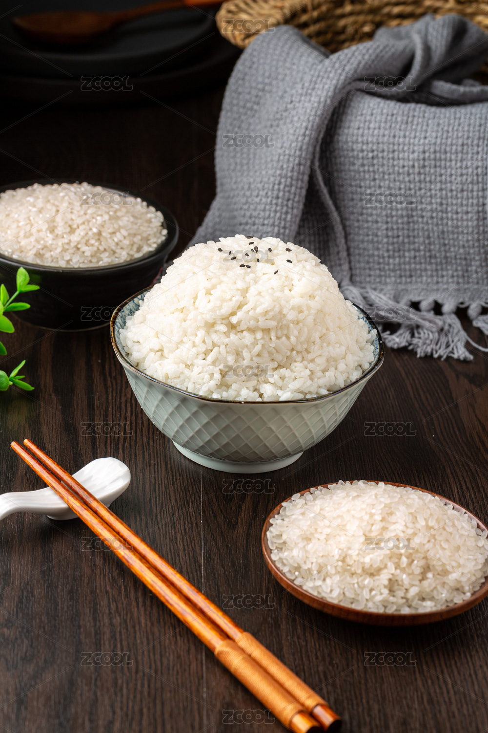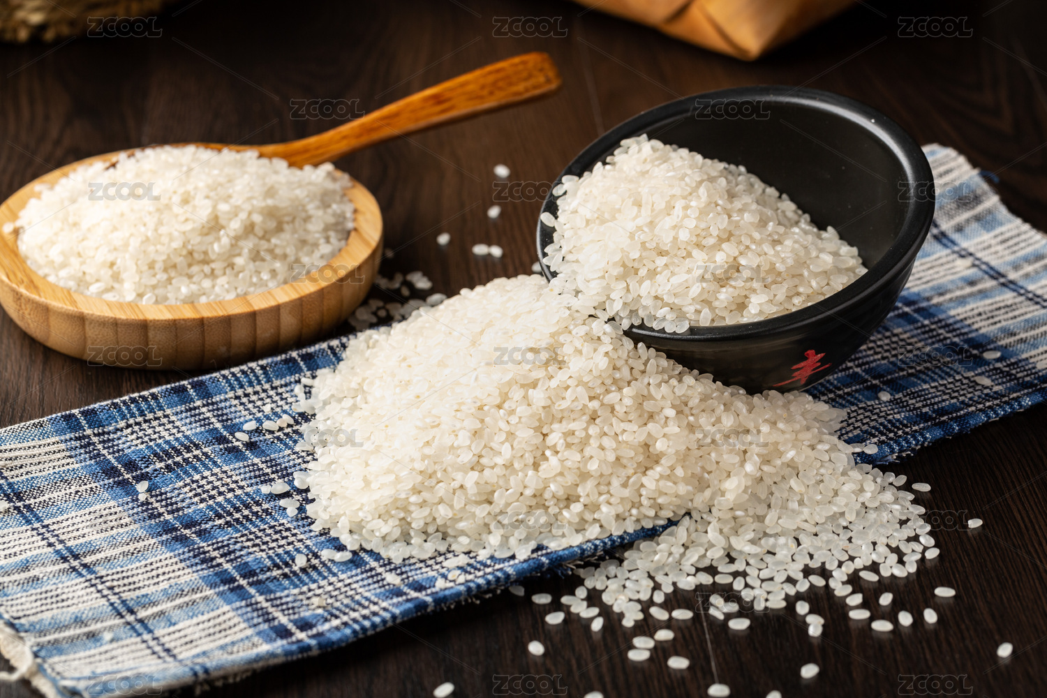 黑色小碗里灑出在粗布上的粳米