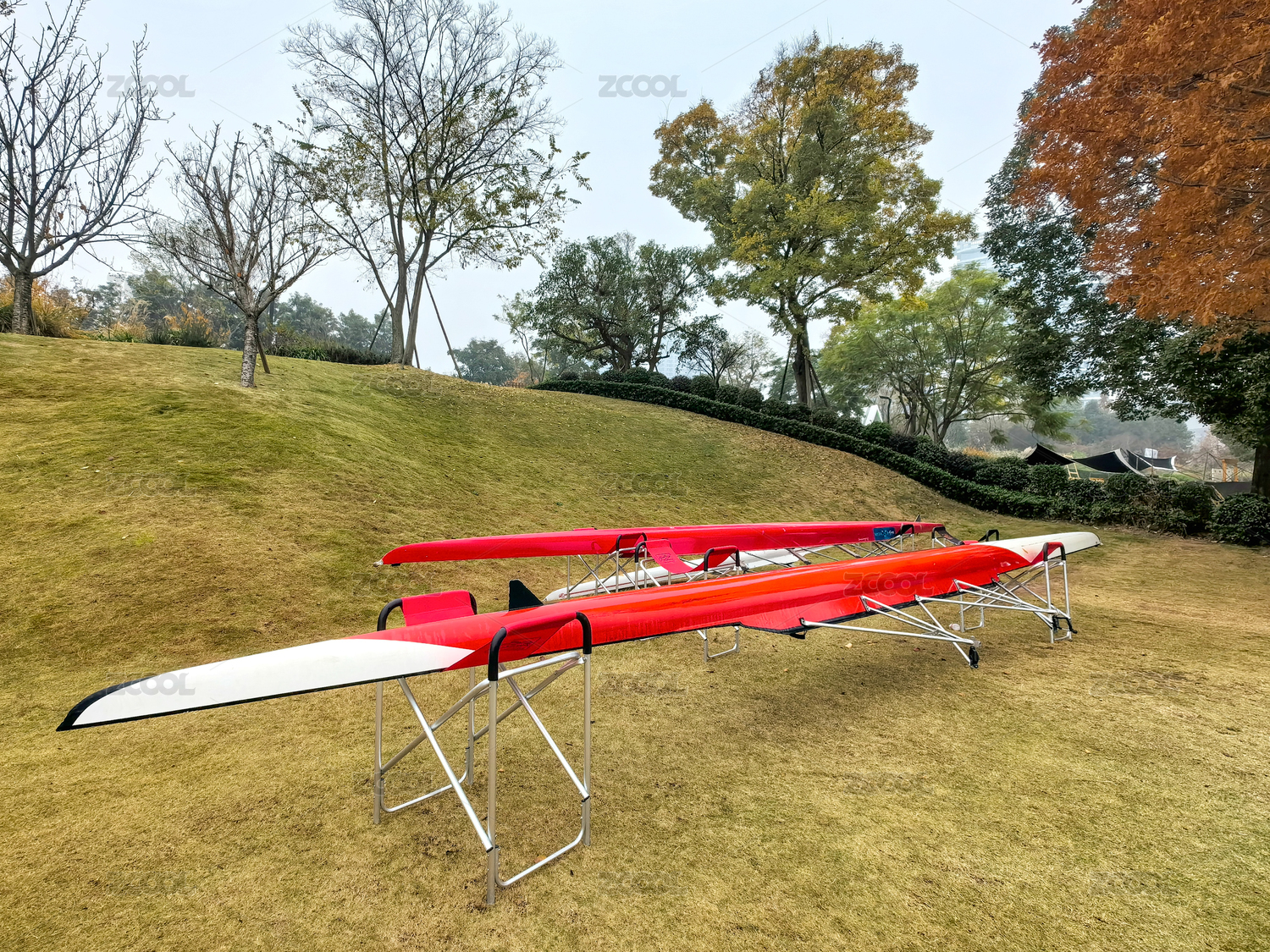 草坪上晾曬的賽艇裝備