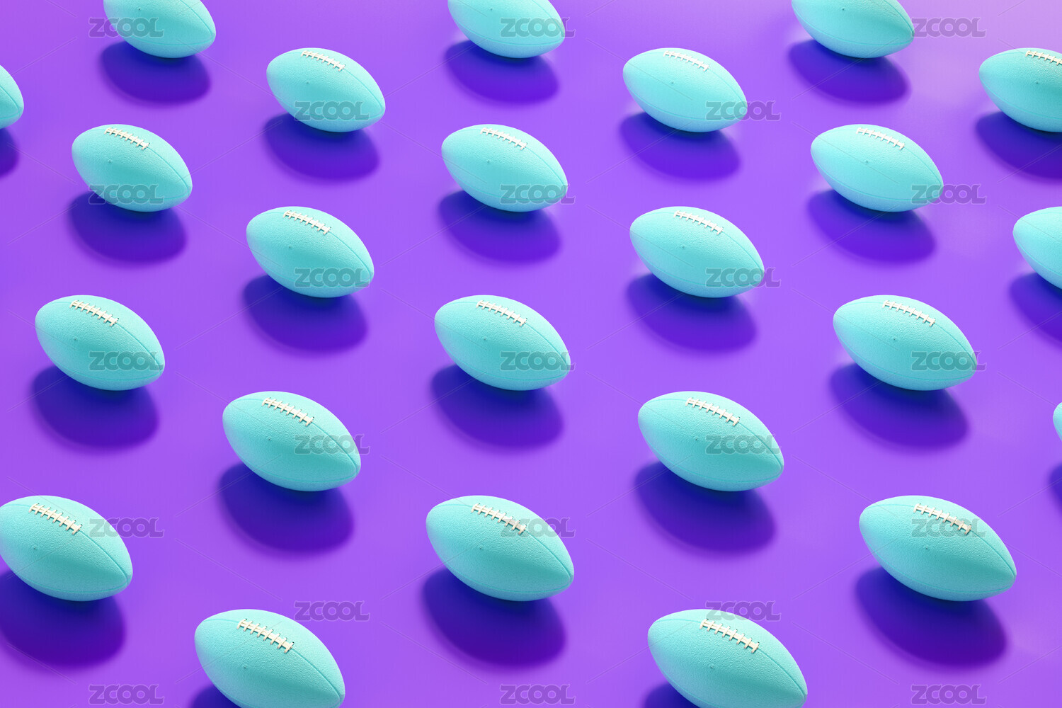3d渲染藍(lán)色橄欖球排列在紫色背景上。運(yùn)動(dòng)裝備。競技比賽。團(tuán)隊(duì)協(xié)作和團(tuán)結(jié)一致的創(chuàng)意設(shè)計(jì)概念背景