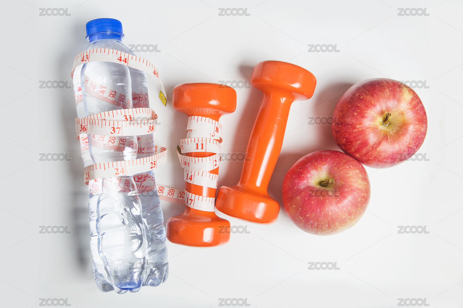 啞鈴水果智能手表等運(yùn)動(dòng)裝備放在地板上