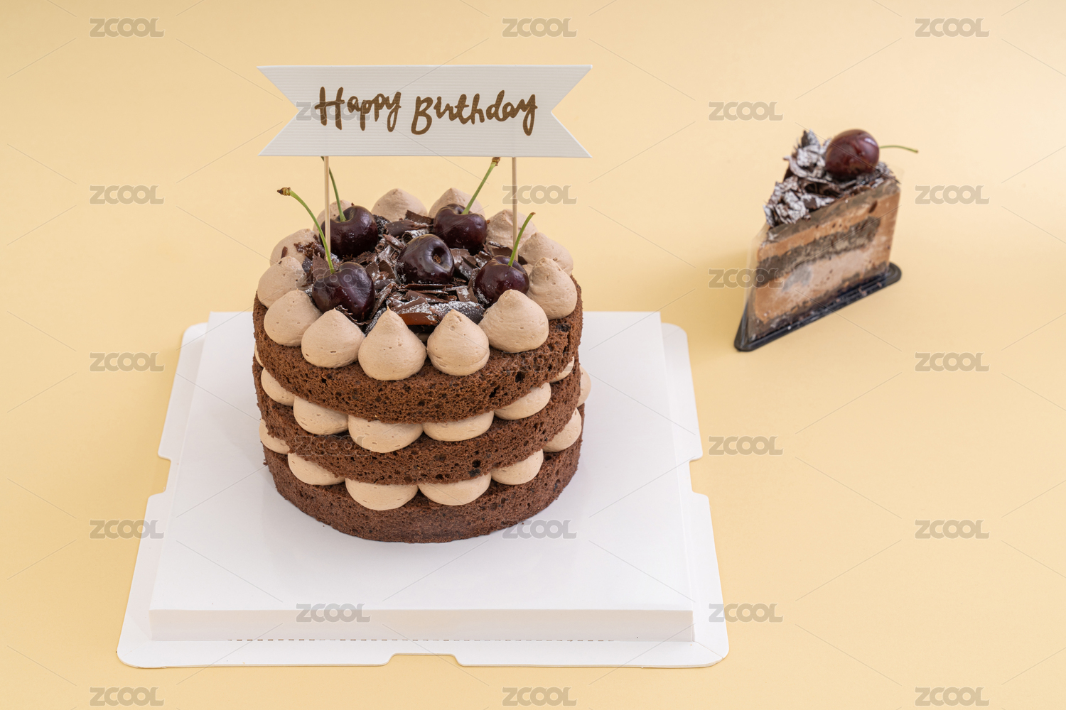 放在桌子上的一個黑森林生日蛋糕
