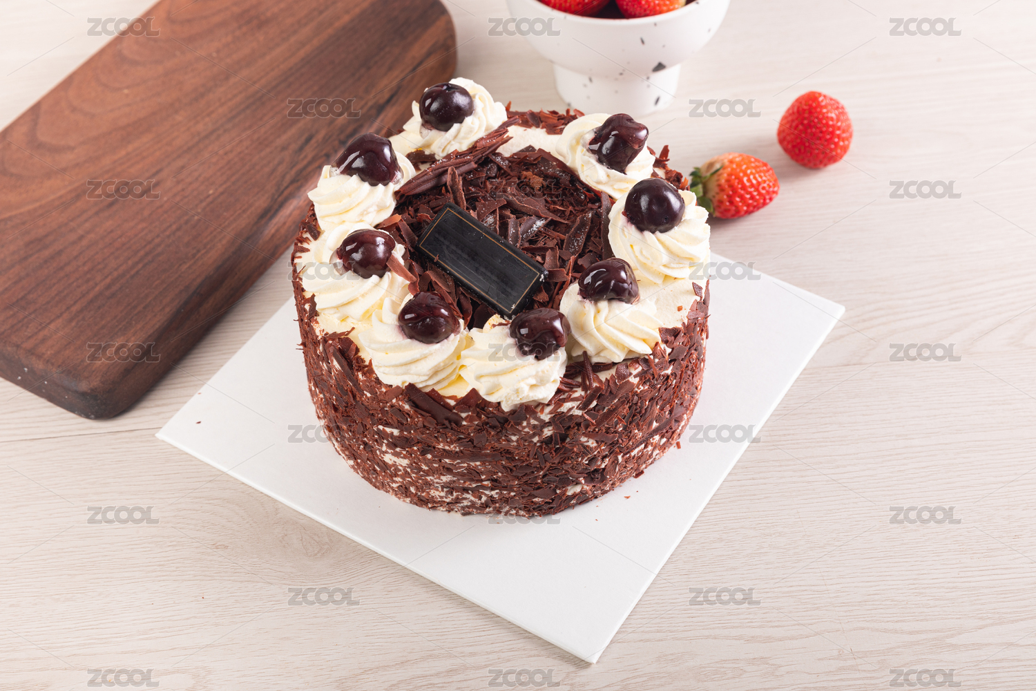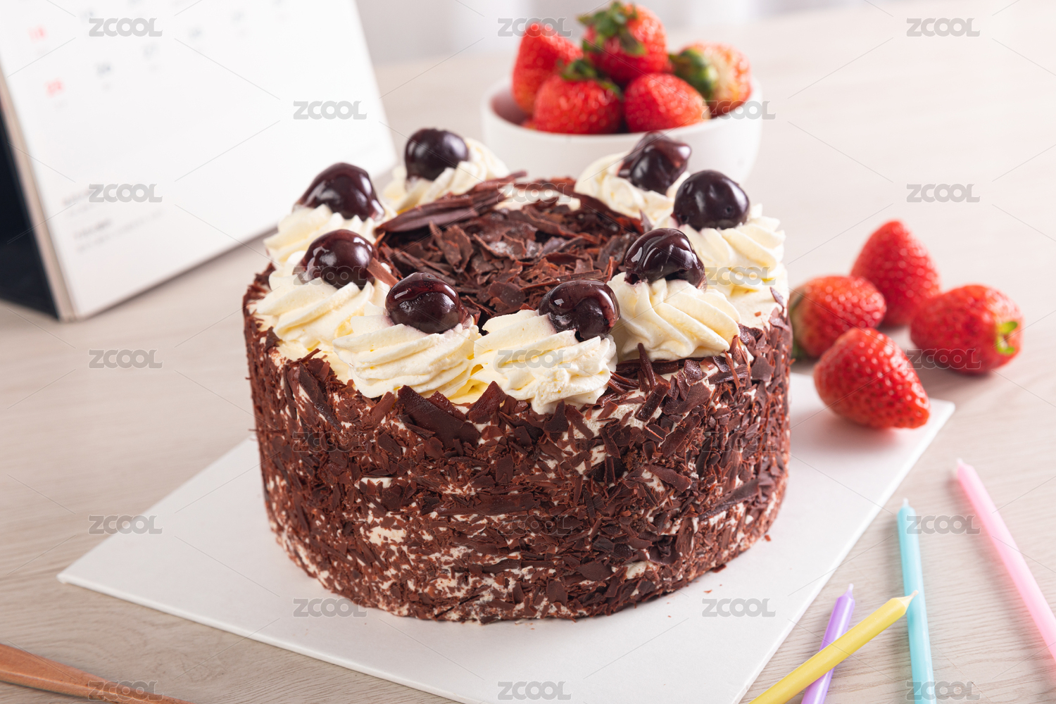 放在桌子上的黑森林巧克力蛋糕
