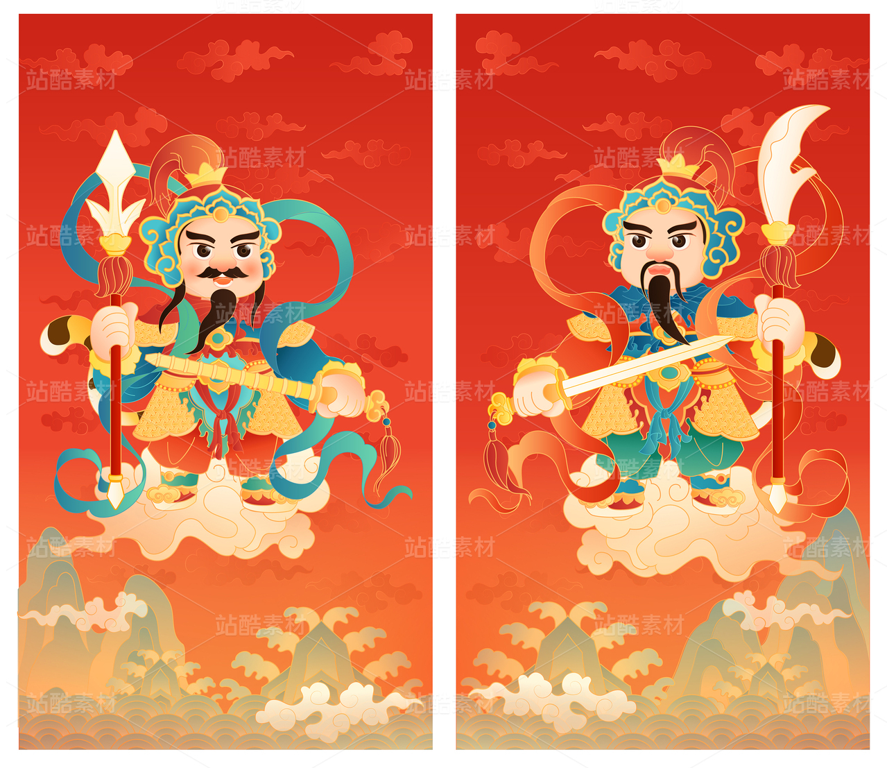 春節(jié)祥云門神國(guó)風(fēng)描邊插畫