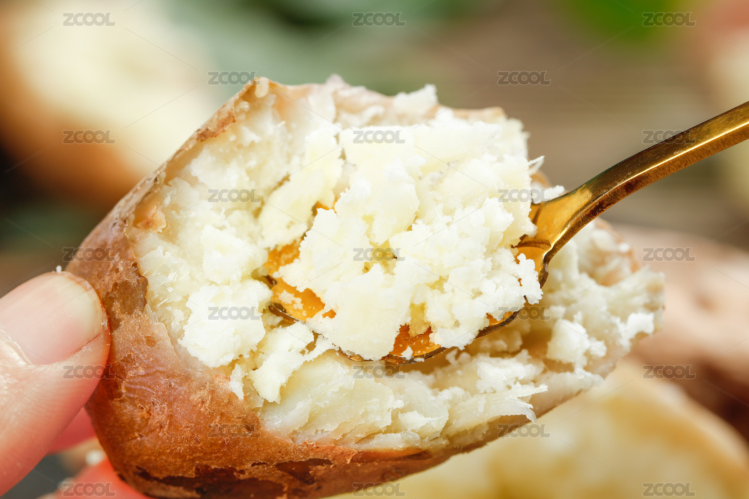 手上拿著半節(jié)蒸熟的板栗薯和勺子上挖著蜜薯