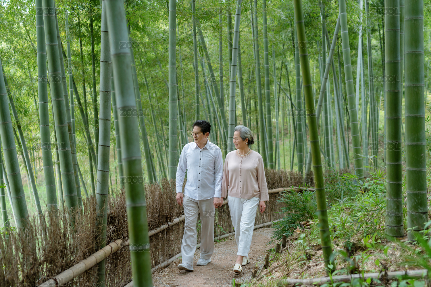 一對在竹林中散步的亞洲老年夫婦