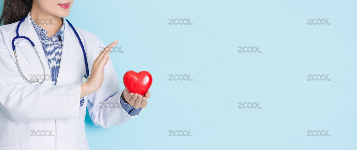 橫幅作物復(fù)制空間。年輕的專業(yè)醫(yī)生的女子拿著心臟顯示藍(lán)色的背景,并使用手顯示與cardiolog概念關(guān)懷的姿態(tài)。