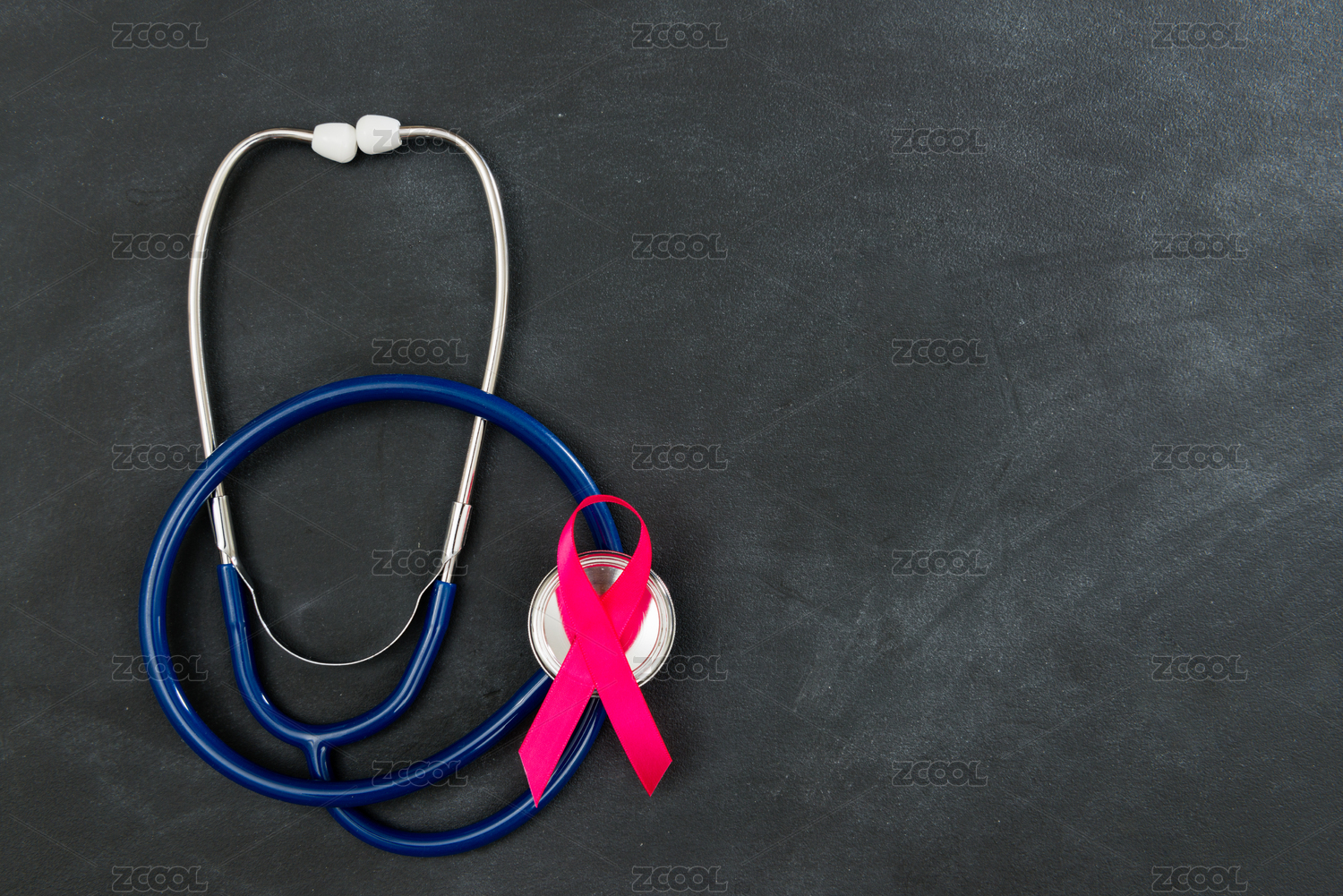 醫(yī)生聽診器設(shè)備關(guān)懷乳腺癌患者的概念被隔絕在黑色背景的黑板。高角度視圖照片。