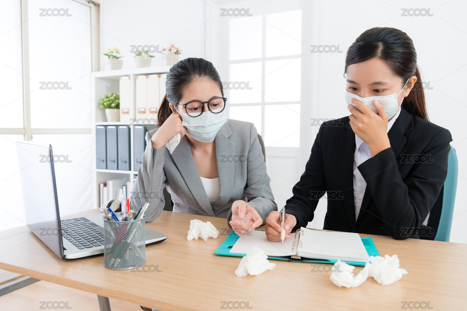 有流感疾病和醫(yī)療戴口罩與同事來,以避免病毒感染討論公司計(jì)劃漂亮的女商人。