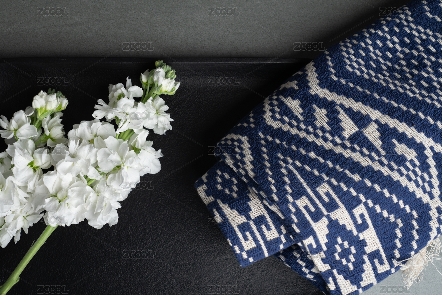 紫羅蘭花卉和藍(lán)色的手織布靜物照