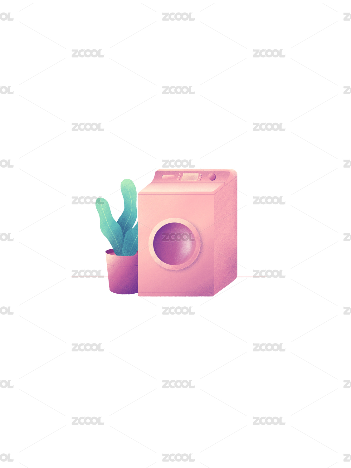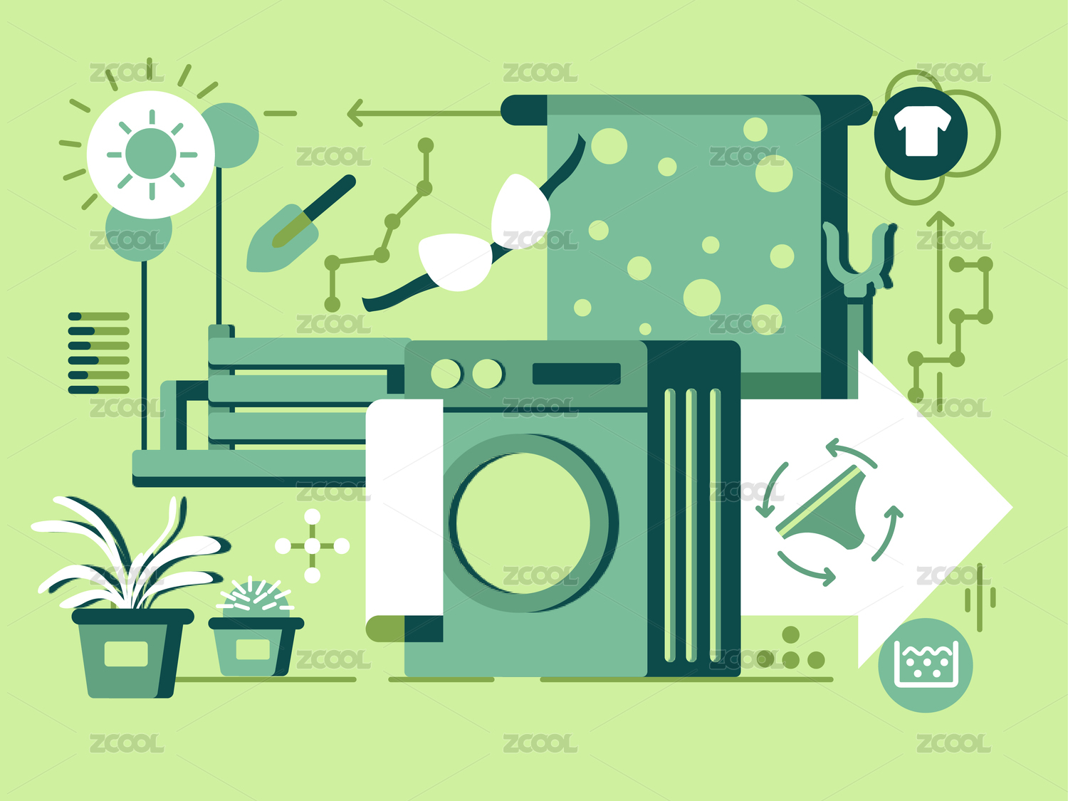 陽臺物品洗衣機被子花園等物件擺拍矢量插畫
