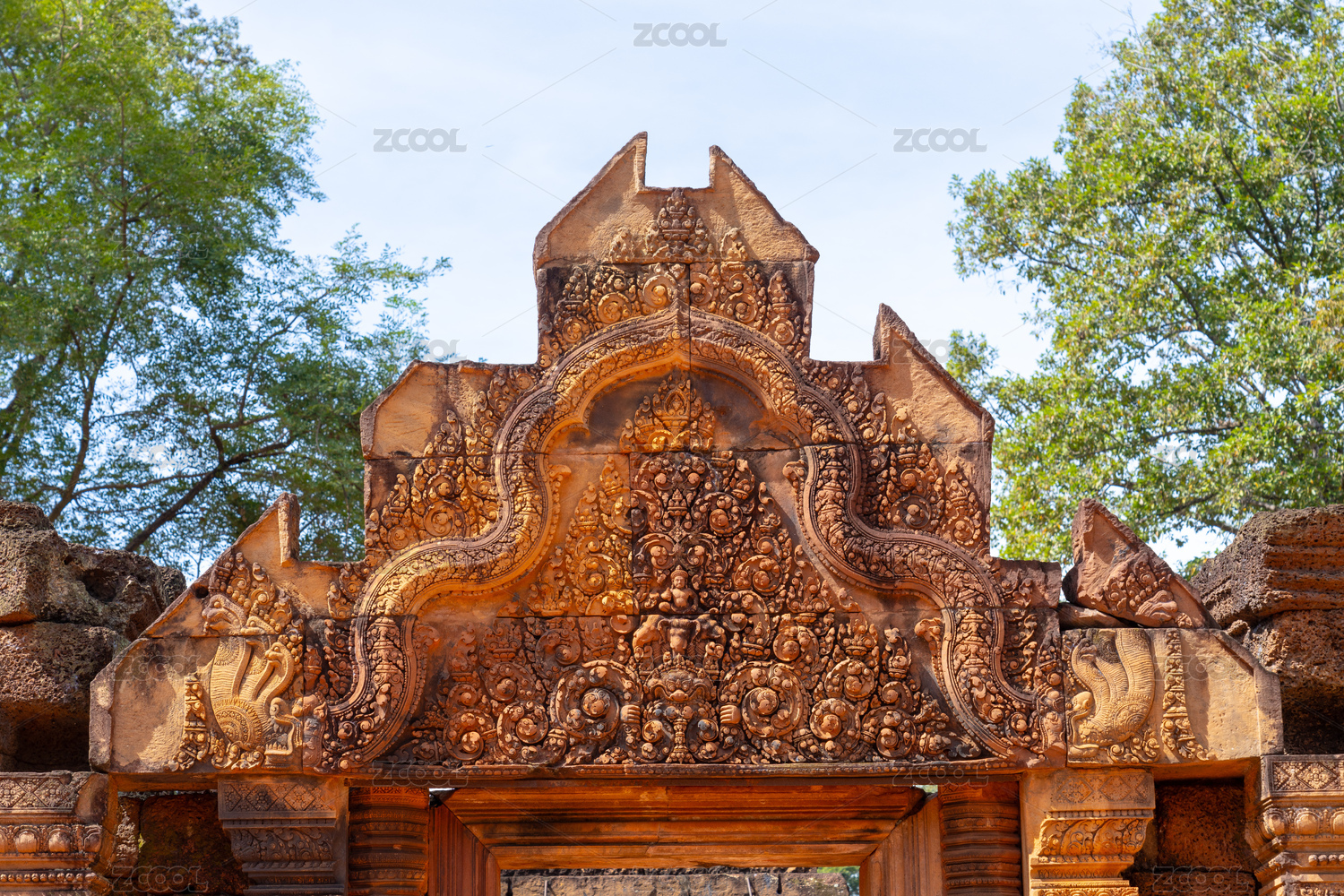 柬埔寨暹粒市女王宮精美的門頭浮雕