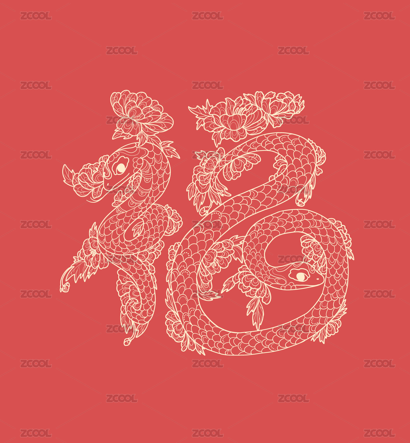 蛇年福字牡丹花與蛇