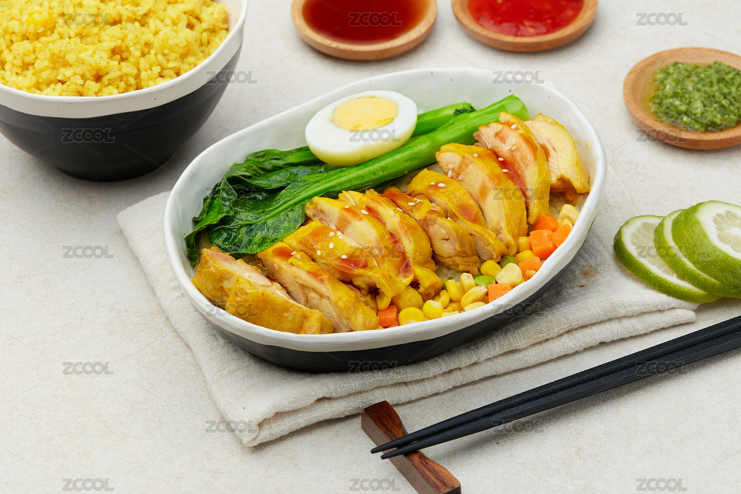白色大理石桌面上的餐墊,餐墊上的海南雞飯