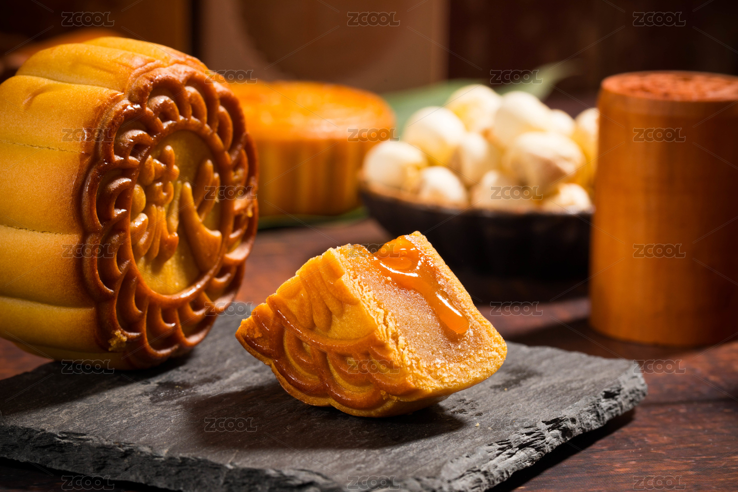 一個(gè)屹立和切開的流心月餅放在黑色石板上