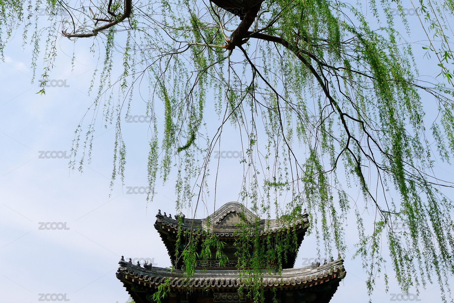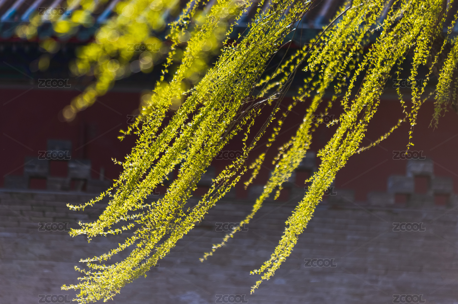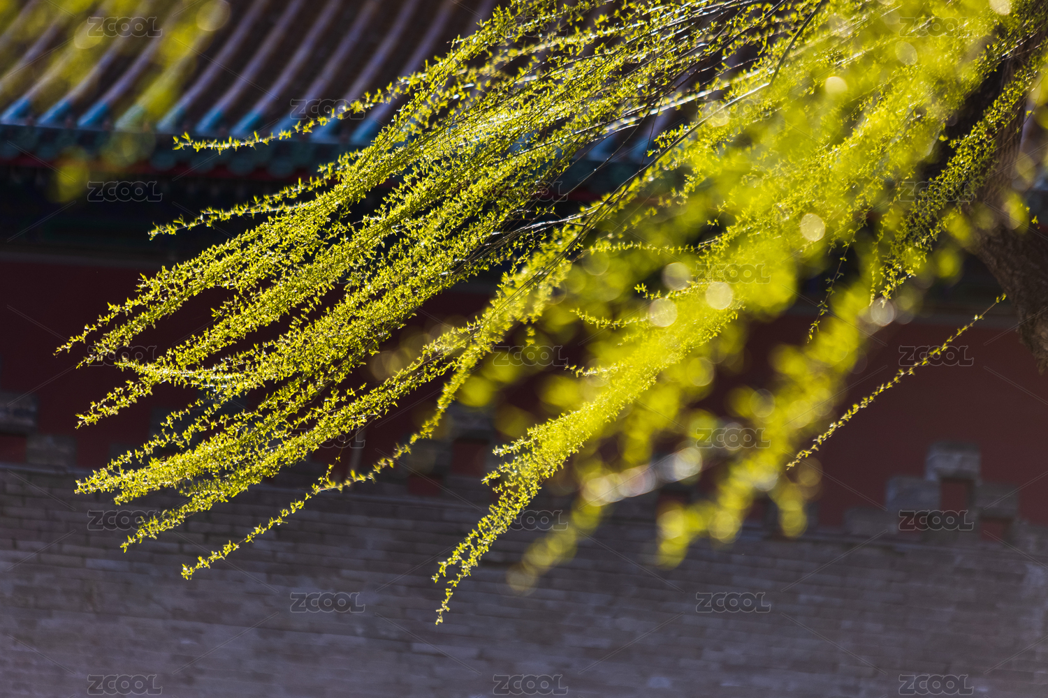 初春溫和陽光下古建筑與新發(fā)芽的垂柳