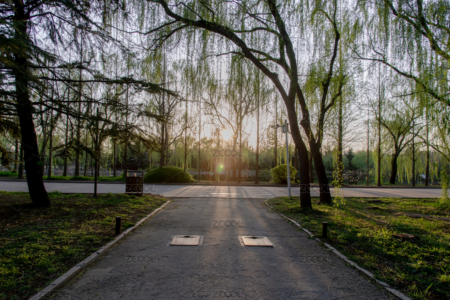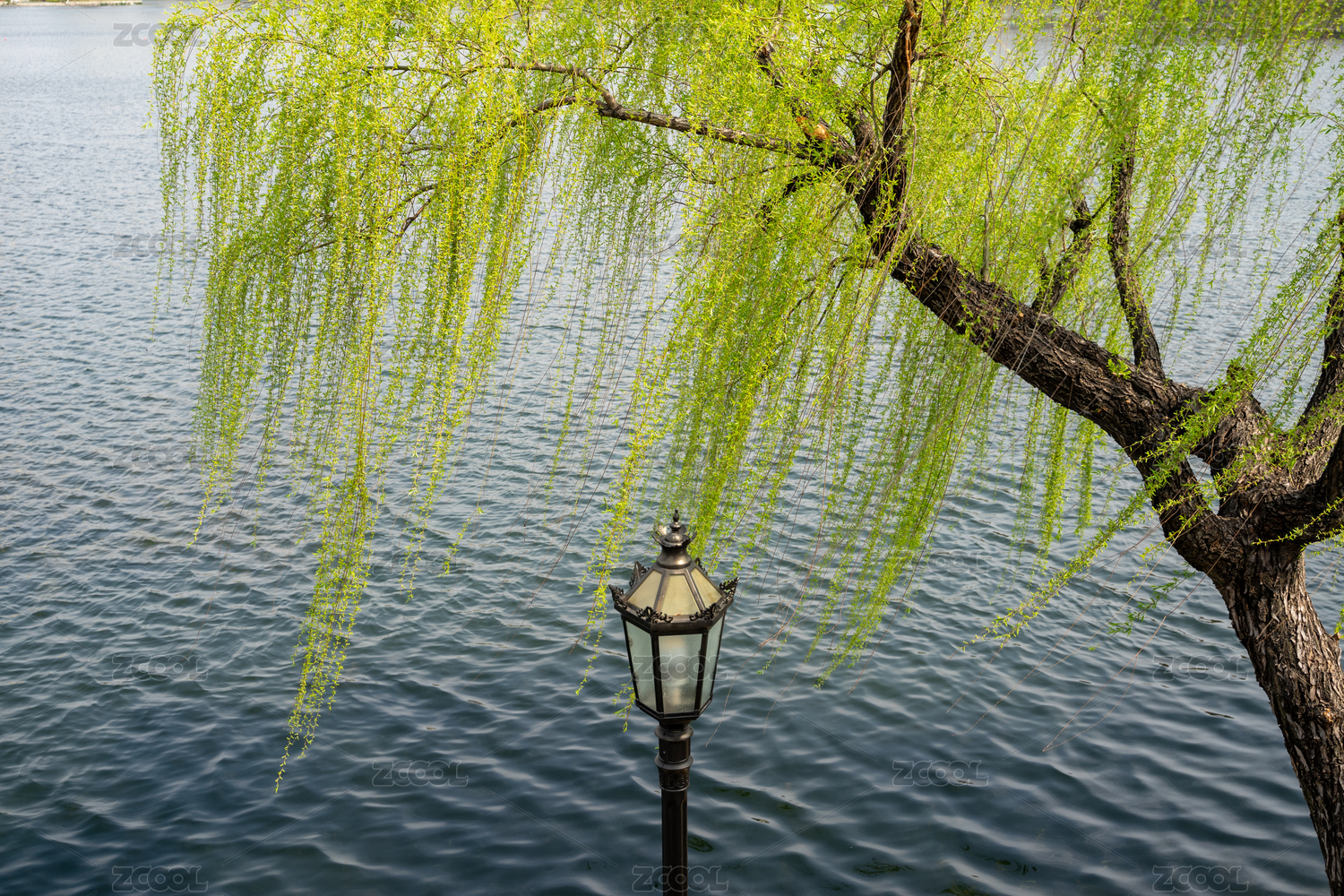 春天湖畔的垂柳與路燈