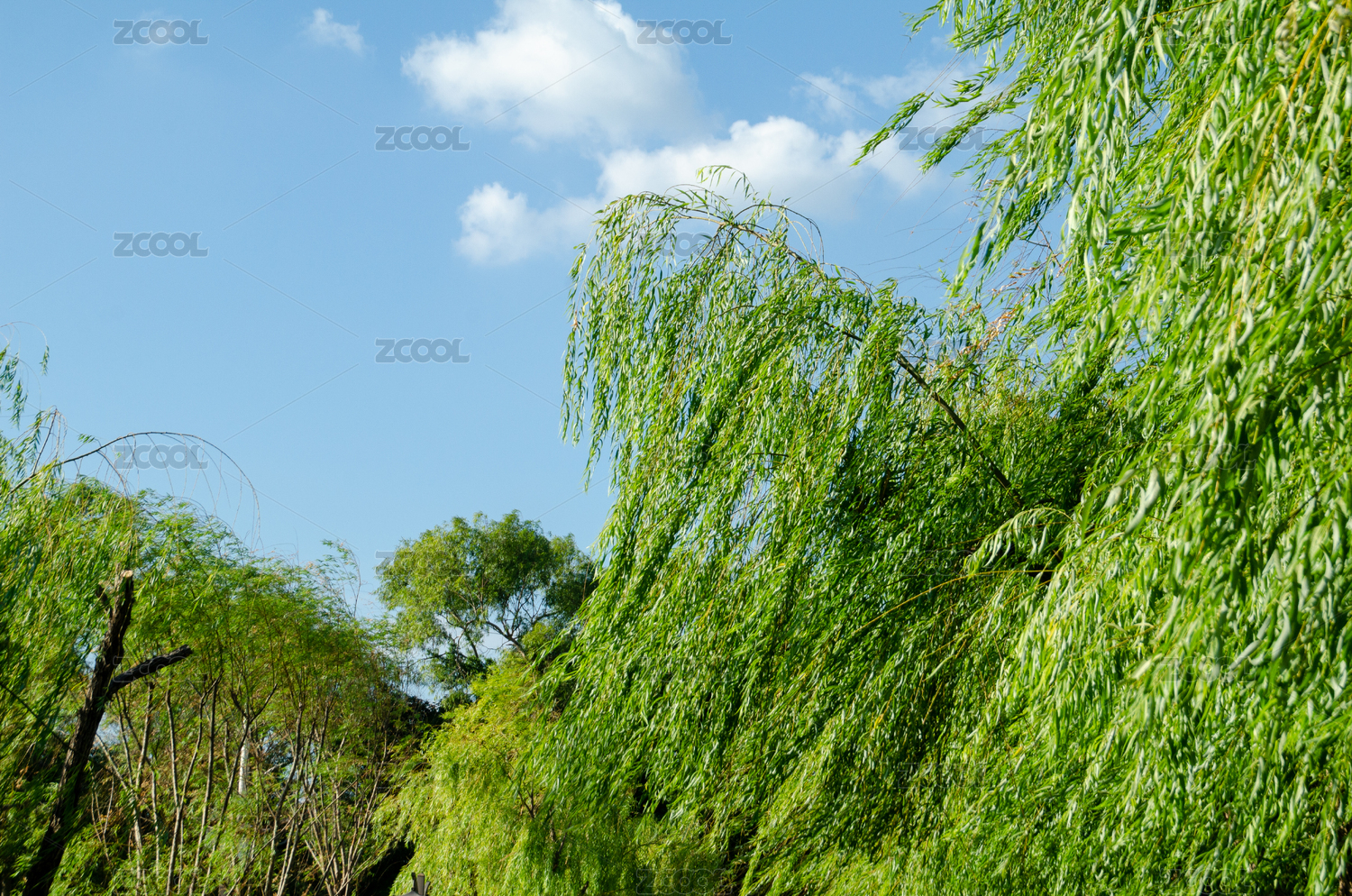 藍天白云下的垂柳景觀