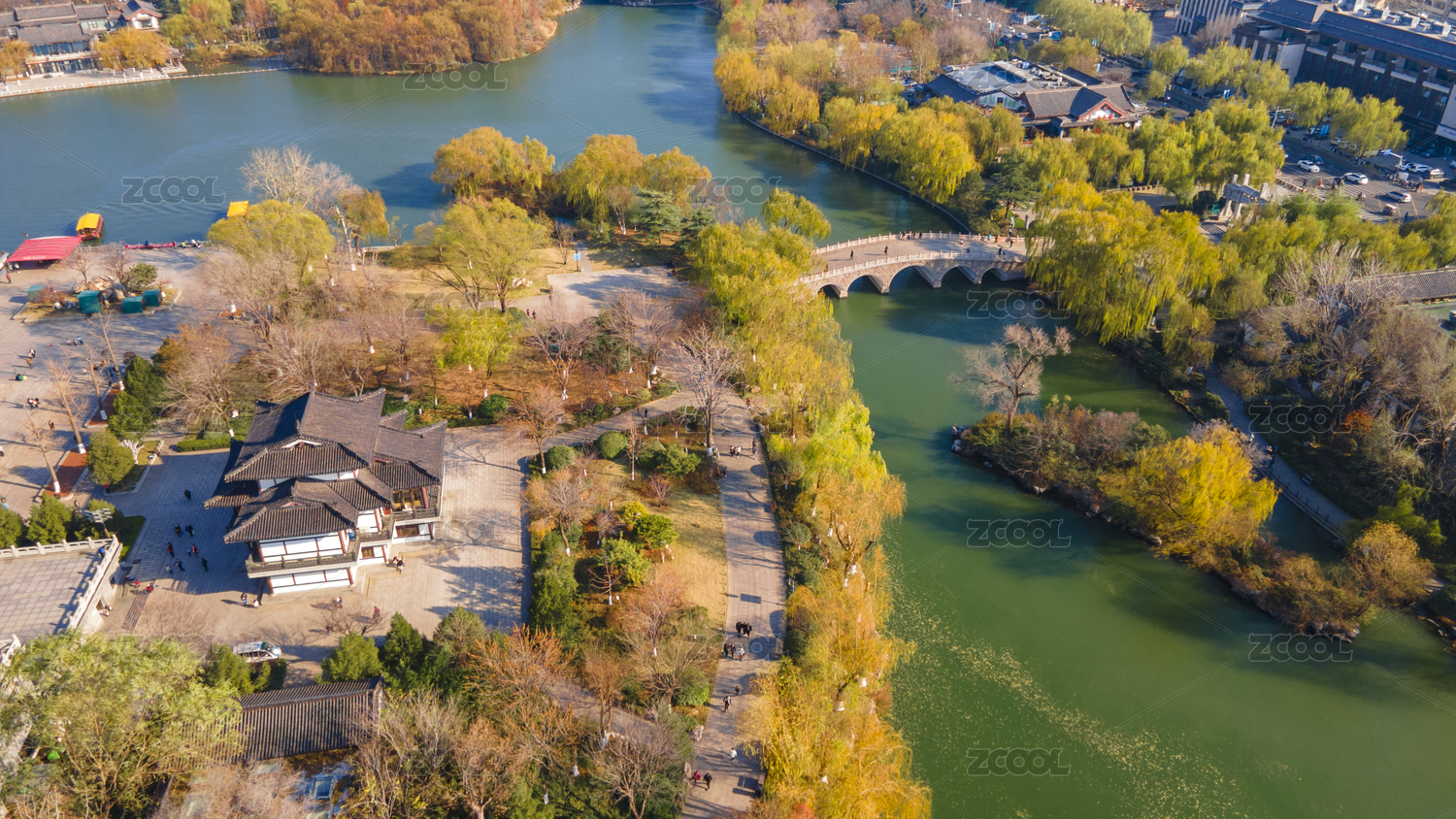 中國山東濟南大明湖金色垂柳